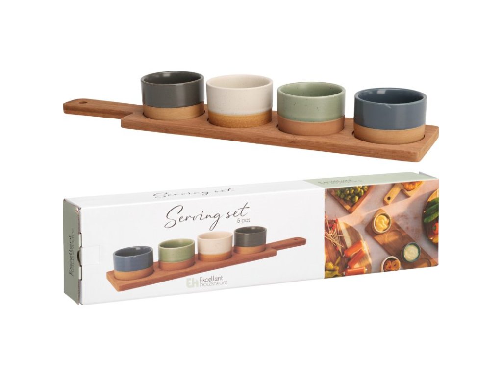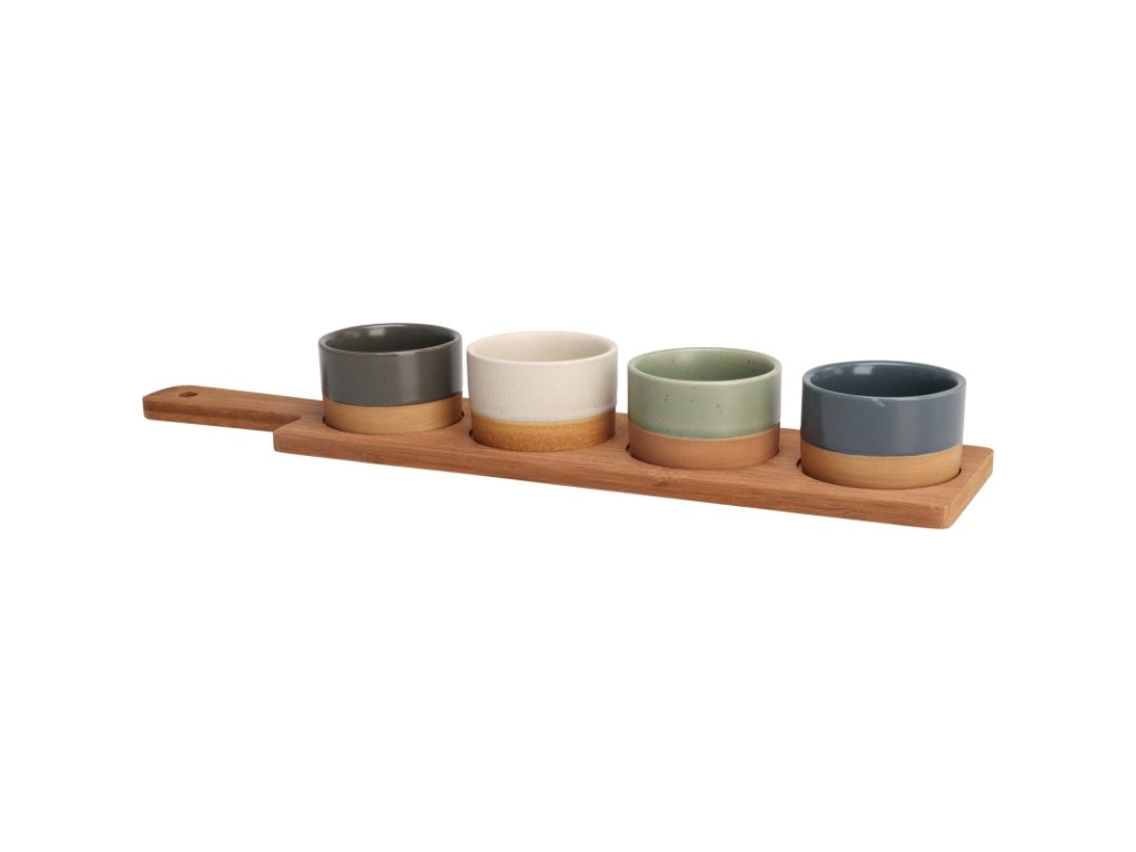 Tato elegantní servírovací sada kombinuje funkčnost a přírodní krásu. Čtyři kameninové misky v tlumených barvách jsou usazeny na podlouhlém prkénku z tmavého bambusu – ideální na servírování omáček, dipů, oříšků nebo sladkostí. Skvěle zapadne do každé kuchyně i na slavnostně prostřený stůl.