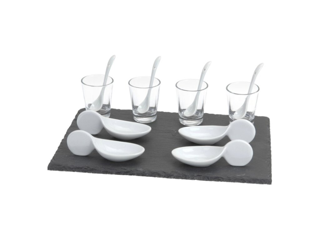 - servírovací set misek (kanapek) a skleniček se lžičkou na tácu pro nejrůznější příležitosti- materiál: porcelán / sklo / břidlice- barva: bílá / transparentní / šedá- perfektní pro servírování předkrmů, pochutin, dipů a omáček- vhodné do myčky nádobí- sada obsahuje břidlicový podnos s protiskluzovými nožkami, 4 porcelánové misky (kanapky), 4 skleničky a 4 porcelánové lžičky- rozměry podnosu: 295 x 200 x 5mm- rozměr skleniček: pr. 42 x 60 mm- průměr dna skleniček: 42 mm- rozměr lžiček: 92 x 20 mm- tvar misky (kanapky): lžička- značka: Excellent HousewareDoplňkové parametry