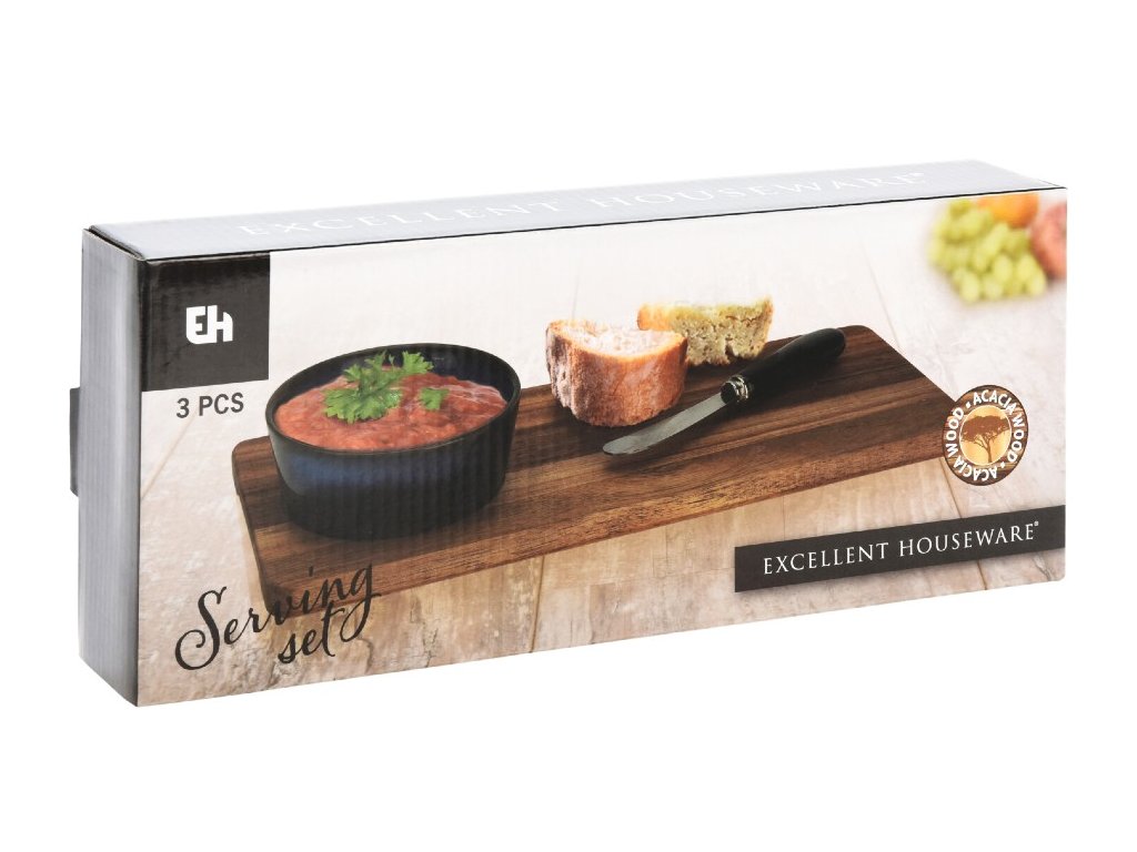 - servírovací set podnosu, misky a nože pro nejrůznější příležitosti- ideálně použijete při servírování předkrmů- materiál: kamenina s lesklou glazurou, akátové dřevo- stylový podnos z akátového dřeva- roztírací nůž s čepelí z nerezové oceli- akátové dřevo je robustní a má krásnou texturu- perfektní pro servírování předkrmů, pochutin, dipů- žáruvzdorné do 200 °C, misku lze využít také k zapékání- miska je vhodná do myčky nádobí- sada obsahuje servírovací tác, misku a nůž- rozměry podnosu: 30 x 12 x 1,2 cm- rozměry misky: 9 x 3,5 cm- nůž 14,9 cm- barva misky: tmavě zelená- značka: Excellent HousewareDoplňkové parametry