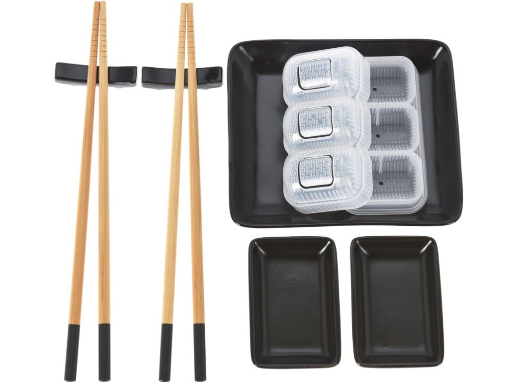 - sushi set pro servírování sushi doma- materiál: keramika, bambusové dřevo- velký keramický servírovací talíř a dva malé- 2 páry bambusových hůlek- talíře mohou do myčky nádobí- perfektní dárek pro milovníky sushi- sada 8 ks obsahuje:- velký servírovací talíř 15 x 13 x 2 cm- 2 x malý servírovací talíř 8 x 5,5 x 1,2 cm- 2 x držák hůlek- 2 x pár bambusových hůlek 24 cm- sushi box 10,5 x 5,6 x 3 cm- barva: černá / dřevo- značka: Excellent HousewareDoplňkové parametry