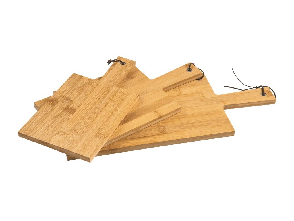 Tato sada prkének je nejen funkční, ale také esteticky příjemná. Bambusový materiál je odolný a snadno se udržuje, což z něj činí ideální volbu pro každodenní použití v kuchyni. Kovový kroužek a kožené lano dodávají prkénekům moderní a praktický vzhled.
