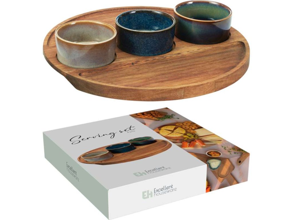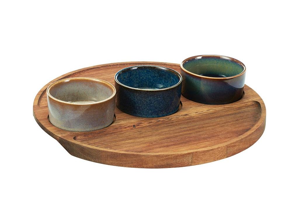 Perfektní sada pro servírování vašich oblíbených dipů, předkrmů nebo pochutin. Kombinace odolné kameniny s reaktivní glazurou v 3 různých barvách a přírodního akátového dřeva vytváří elegantní a praktický doplněk vašeho stolování.