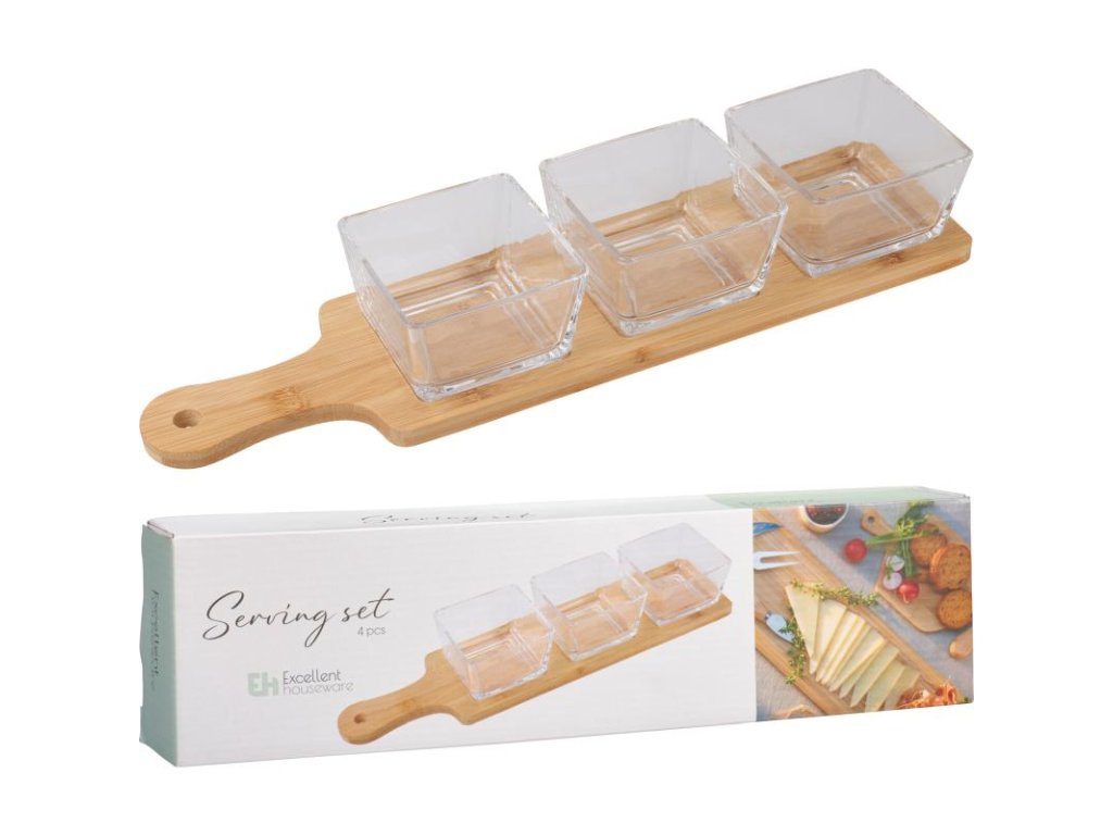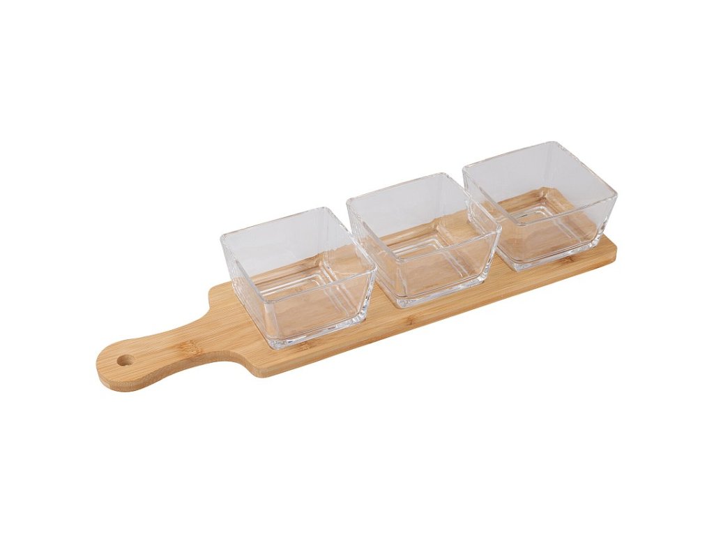 Servírovací sada 4 ks – 3 skleněné misky na bambusovém podnose