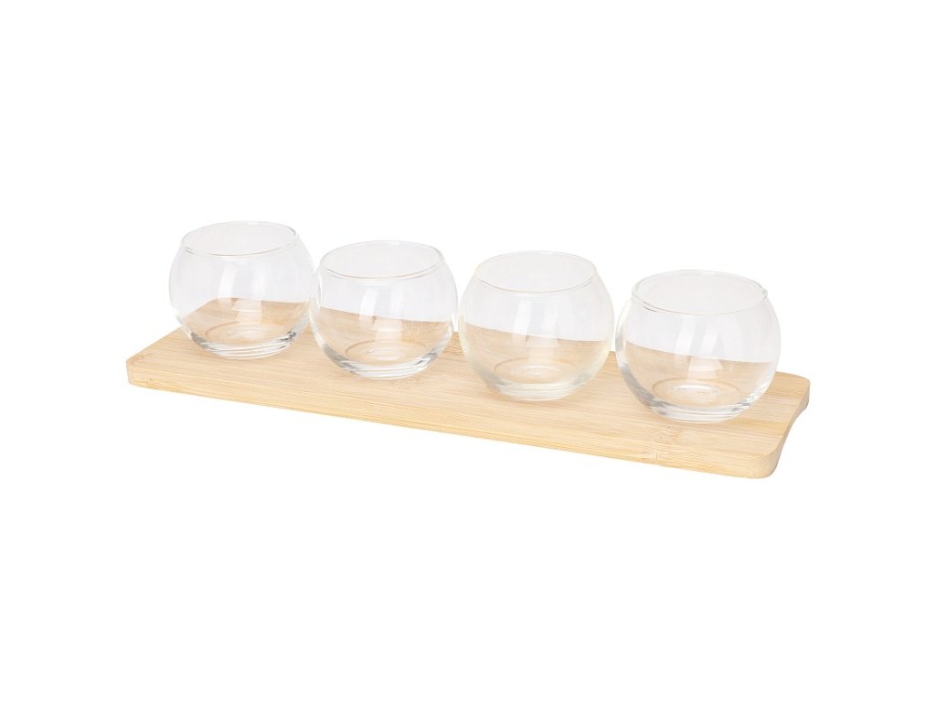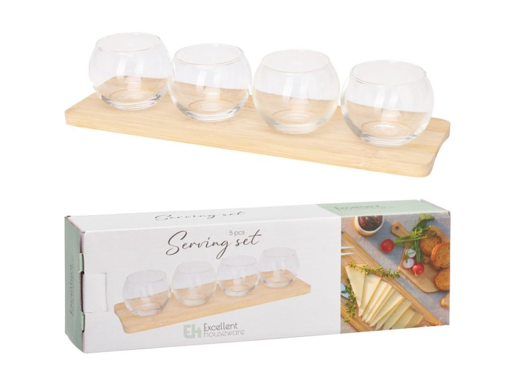 Servírovací sada 5 ks EXCELLENT – skleněné misky na bambusovém tácku