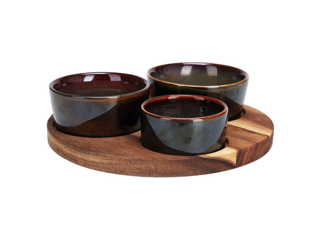 - servírovací set misek pro nejrůznější příležitosti- materiál: kamenina s lesklou glazurou- všechny misky jsou uloženy na stylovém podnosu z akátového dřeva- perfektní pro servírování předkrmů, pochutin, dipů a omáček- žáruvzdorné do 200 °C, misky lze využít také k zapékání- misky jsou vhodné do myčky nádobí- sada obsahuje 3 kusy různě velkých misek a 1 kulatý podnos- rozměry misek: 10 x 4 cm / 9 x 3,5 cm / 7 x 3,4 cm- rozměry podnosu: 20 x 1,2 cm- barva: hnědáDoplňkové parametry