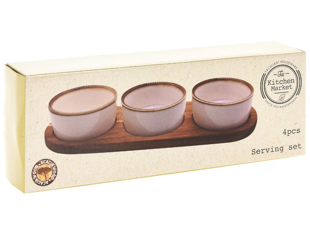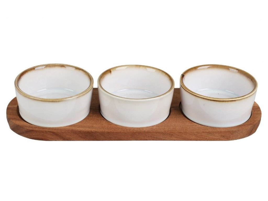- servírovací set misek na podnosu pro nejrůznější příležitosti- ideálně použijete při servírování předkrmů, dipů a pochutin- materiál: keramika s lesklou glazurou, akátové dřevo- stylový podnos z akátového dřeva- akátové dřevo je robustní a má krásnou texturu- žáruvzdorné do 200 °C, misky lze využít také k zapékání- misky jsou vhodné do myčky nádobí- sada obsahuje servírovací tác a 3 misky- rozměry podnosu: 29 x 10 x 1,2 cm- rozměry misky: 8,5 x 4 cm- barva: bílá / dřevo- značka: Excellent HousewareDoplňkové parametry