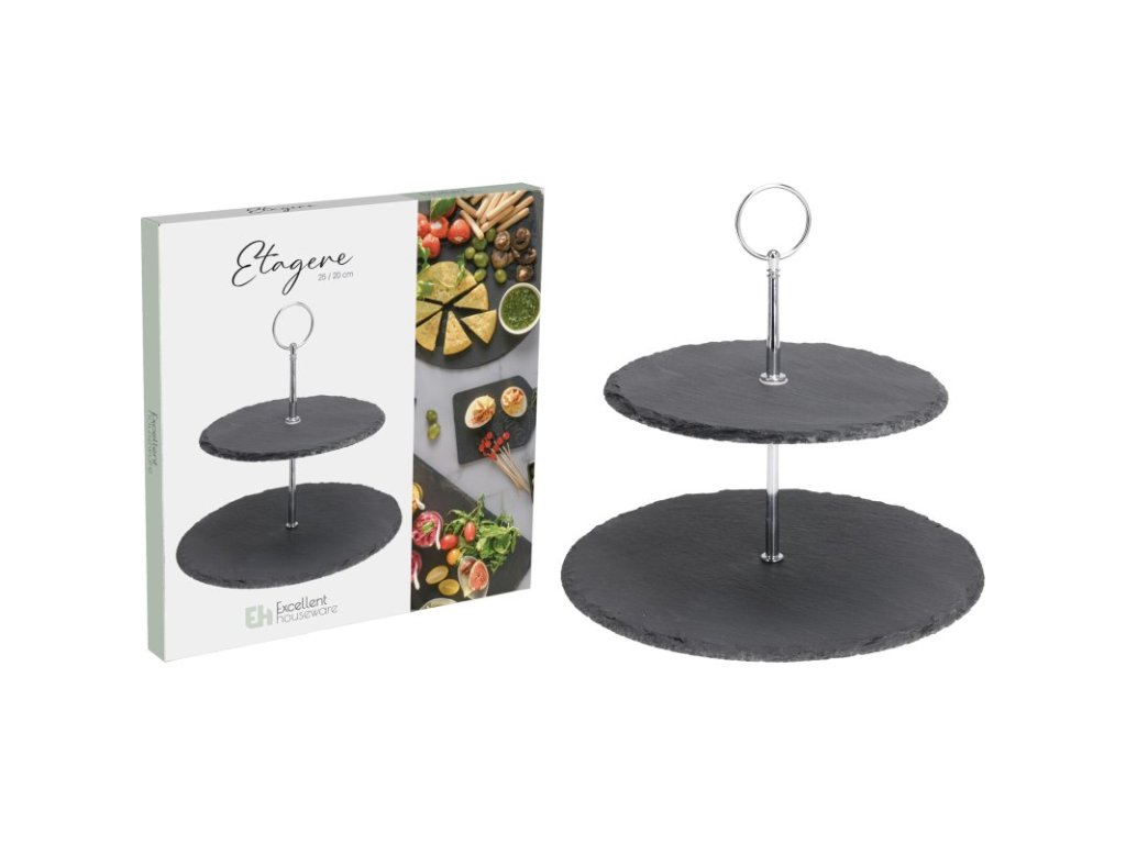 Stylový a praktický dvoupatrový stojan z přírodní břidlice, ideální pro servírování různých druhů pochutin a dezertů.