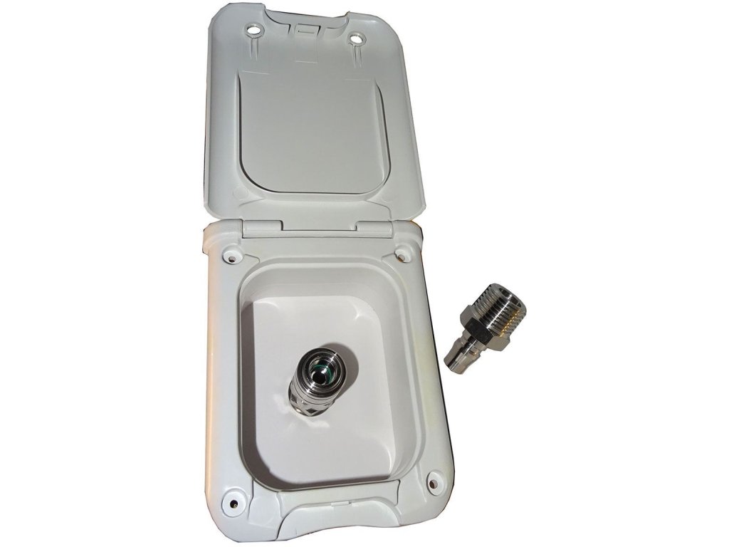 Externí dvířka s přípojkou sprchy - bílé Dvířka pro připojení sprchy nebo hadice s automatickým uzavíracím ventilem při vytažení koncovky. Připojovací závit 1/2”, montážní otvor 110x90mm, zástavná hloubka 75mmDoplňkové parametry