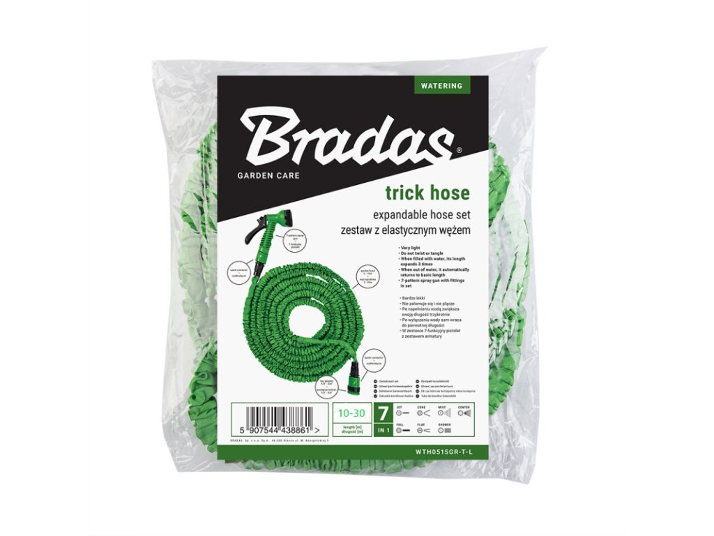 Smršťovací hadice TRICK HOSE je oproti ostatním hadicím lehká a díky tomu ušetříte námahu, kterou jste vynaložili při používání běžných, objemných hadic. Tato hadice se roztáhne až na trojnásobek své délky pod tlakem vody (10m bez vody = 30m pod tlakem vody). Snadno ji lze uskladnit. Pod tlakem vody se hadice automaticky natáhne a po vypuštění vody se automaticky vrátí zpět do původní velikosti. Součástí balení je i 7-funkční postřikovač, dvě rychlospojky a připojení kohoutku 1/2" s redukcí 3/4" (možnost napojení na kohoutek atd..).