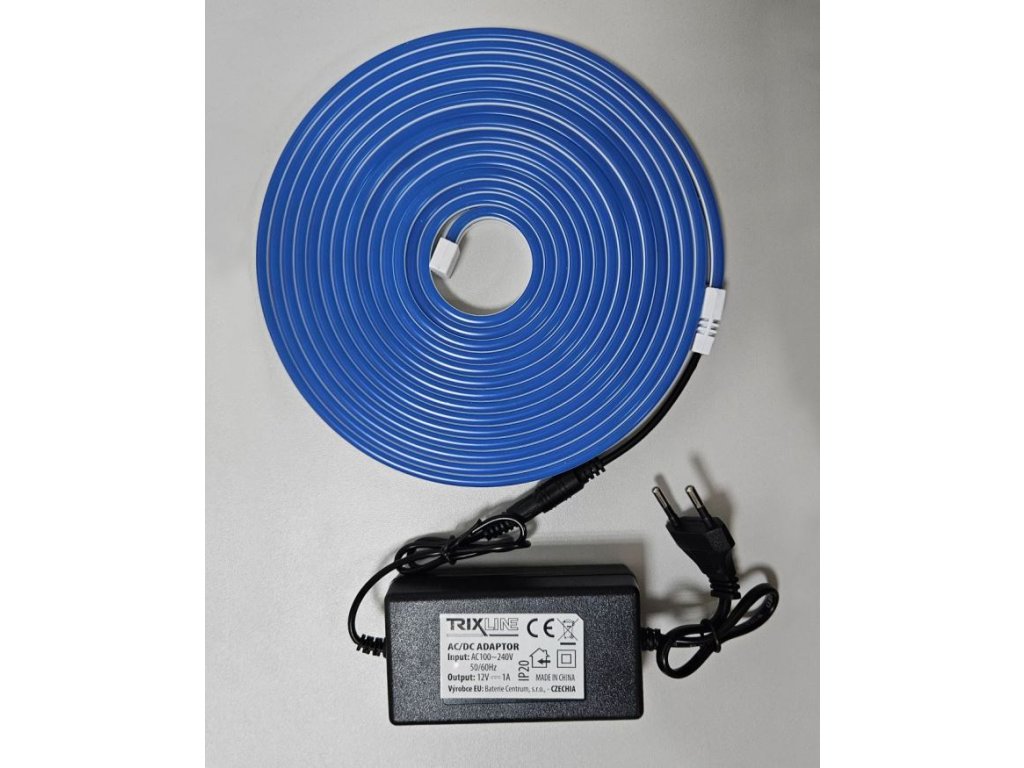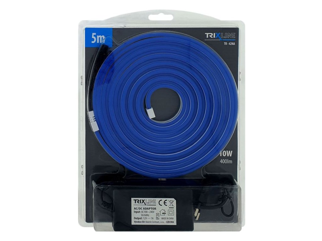 Flexibilní NEONOVÝ LED pásek - modrý 5m, IP65, TRIXLINE TR-42NA Neonový modrý LED pásek TR-40NA Trixline s adaptérem pro připojení do sítě. Designový prvek, který vnese do prostoru moderní atmosféru. Ideální pro vytváření dekorací k slavnostním příležitostem jakojsou večírky, narozeninové oslavy, plesy, Vánoce, svatby, Halloween, Silvestr. Výzdoba interiéru dětských pokojů, obýváků, restaurací, barů, hospod, klubů, heren apod. Pásek lze snadno ohnout do libovolného tvaru, obrazce, nápisu či reklamního textu a zastřihnout na požadovanou délku každých 2,5cm mezi černými drátky.Parametry: