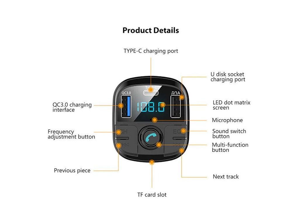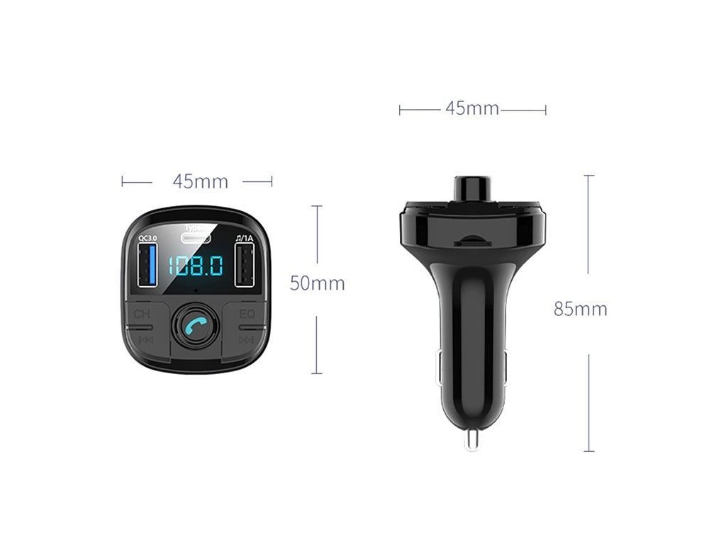 FM modulátor (transmitter), bluetooth, přehrávač MP3, nabíječka BT29 Užitečná pomůcka do auta združující více funkcí:- přehrávač MP3