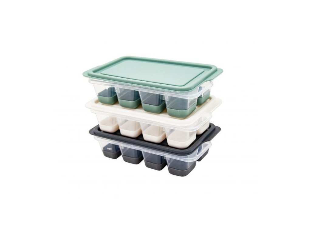 Plastová forma na 8ks kostek ledu s víčkem.Forma je vybavena silikonovým dnem pro snadné vytlačení kostek.