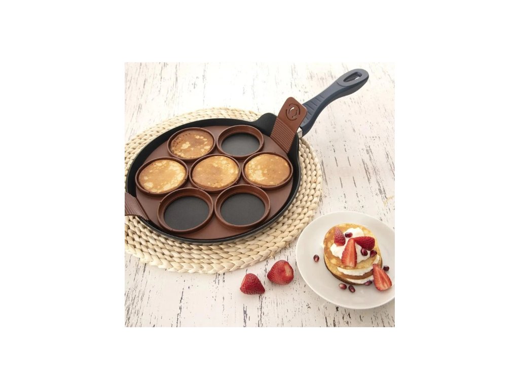 Silikonová forma na 7 lívanečků/volských ok zaručí snadnou a rychlou přípravu těchto pochoutek. Formu položíte na dno pánve a do každého tvořítka nalijete připravené těsto nebo rozklepnete vajíčko. Materiál: silikon. Odolává teplotám od -40 °C do +220 °C. Rozměry: pr. 24 cm, pr. tvořítka 6,5/7,5 cm, v. 1,1 cm. Vhodná do myčky, klasické trouby i MVT.