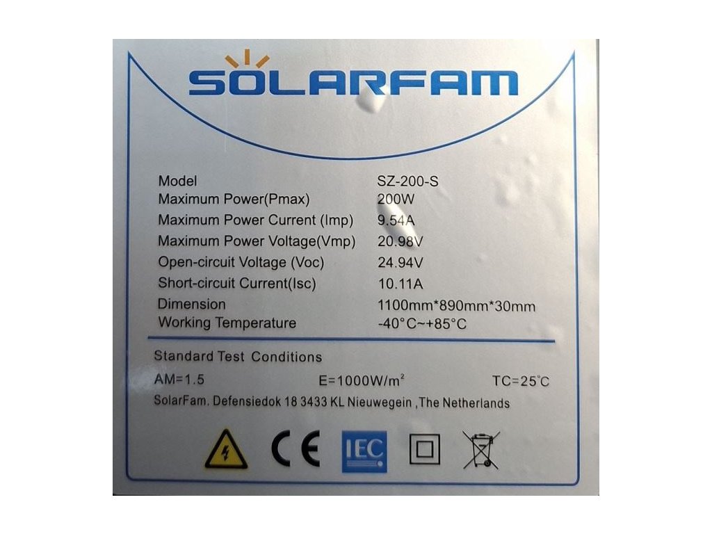 Fotovoltaický solární panel 12V/200W, SZ-200-S,1100x890x30mm Fotovoltaický panel vyrobený z monokrystalického křemíku. Duralový rám 30mm, krycí sklo.Díky vyššímu napětí Ump je vhodný i pro MPPT regulátory pro systémové napětí 12V.