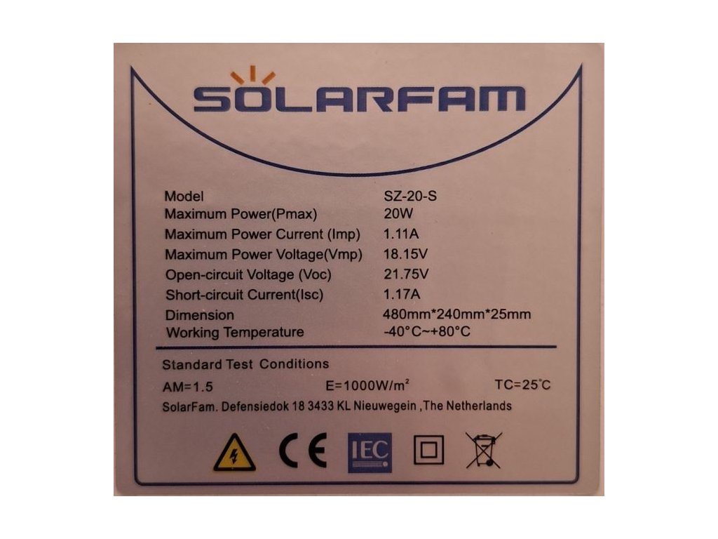 Fotovoltaický solární panel 12V/20W, SZ-20-S, 480x240x25mm Fotovoltaický panel vyrobený z monokrystalického křemíku. Duralový rám 25mm, krycí sklo.**Elektrické parametry:**