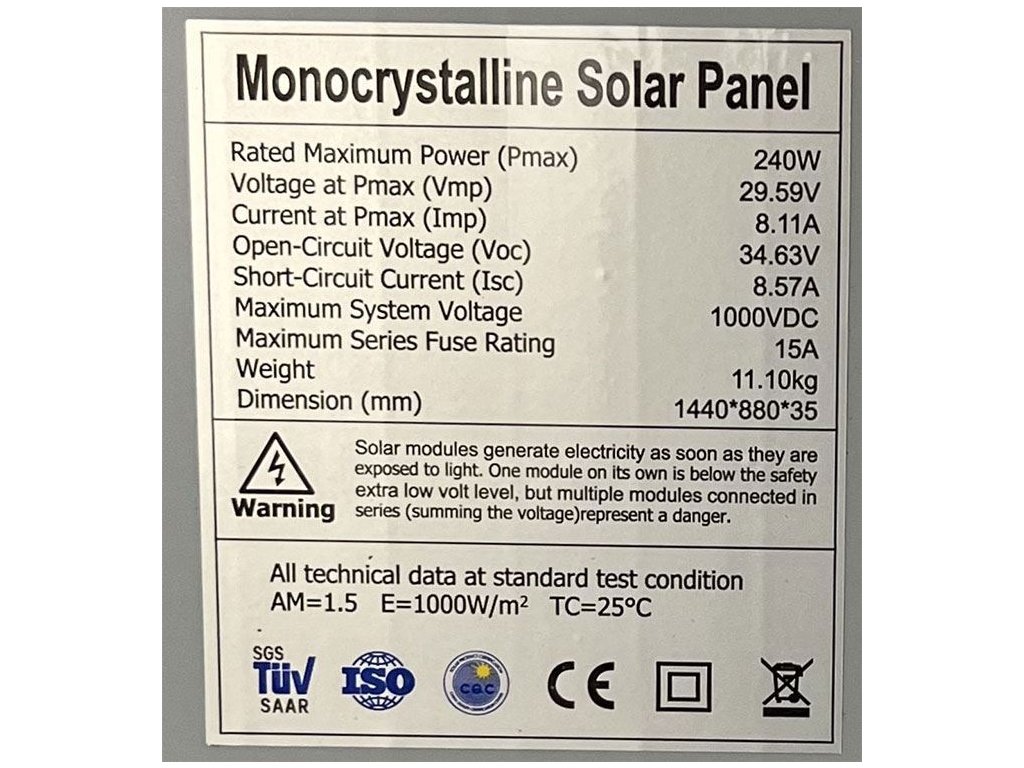 Fotovoltaický solární panel 24V/240W monokrystalický, 1485x990x35mm Fotovoltaický panel vyrobený z monokrystalického křemíku. Duralový rám 35mm, krycí sklo. Zvláště vhodný pro karavany s palubním napětím 12V v kombinaci s MPPT regulátorem, pro nějž má ideální výstupnínapětí.**Elektrické parametry:**