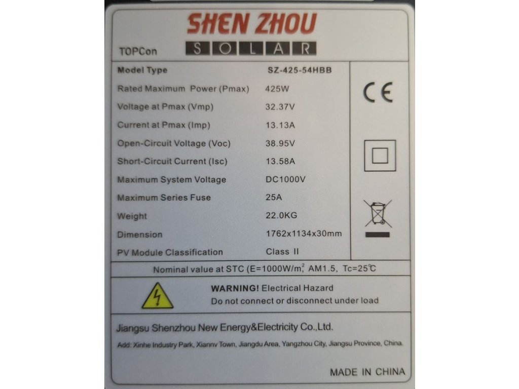 Fotovoltaický solární panel Shen Zhou 425W SZ-425-54HBB 1762x1134x30mm