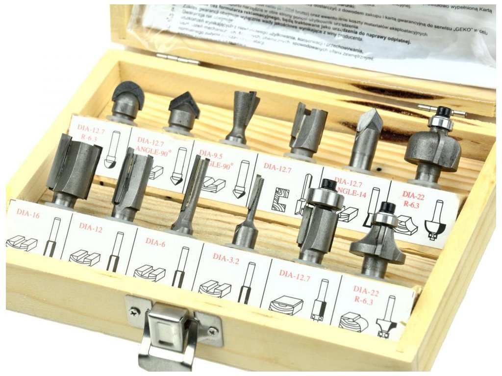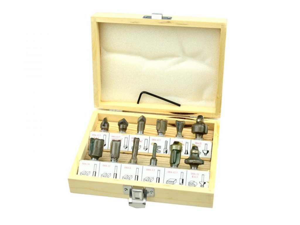 Sada 12 ks tvarových fréz na dřevo umožňující přesné zpracování materiálu. Čepele z rychlořezné oceli HSS umožňují použití fréz pro zpracování masivního dřeva, dřevotřísky, MDF a dalších materiálů na bázi dřeva. Použitá ložiska snižují valivý odpor, proto jsou frézy ideální pro tvarování oblých materiálů. Celé to bylo umístěno v praktickém dřevěném kufříku, kde má každý vykrajovátka své podepsané místo.