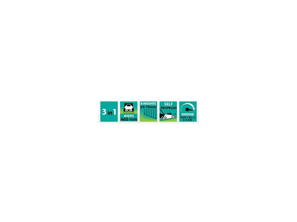 Tato sekačka se systémem 3v1 (sečení se sberem do koše, sečení se zadním výhozem a mulčování) je vhodná na sečení plochy do 1000 m2. Nastavitelná výška sečení v osmi pozicích od 25–70 mm. Nastavení je centrální, jednou pákou. Kolečka jsou opatřena kulovými ložisky, a tak se společně s pojezdem postarají o snadnou ovladatelnost zcela bez námahy. Sekačka má držák na nápoje a praktickou přihrádku.
