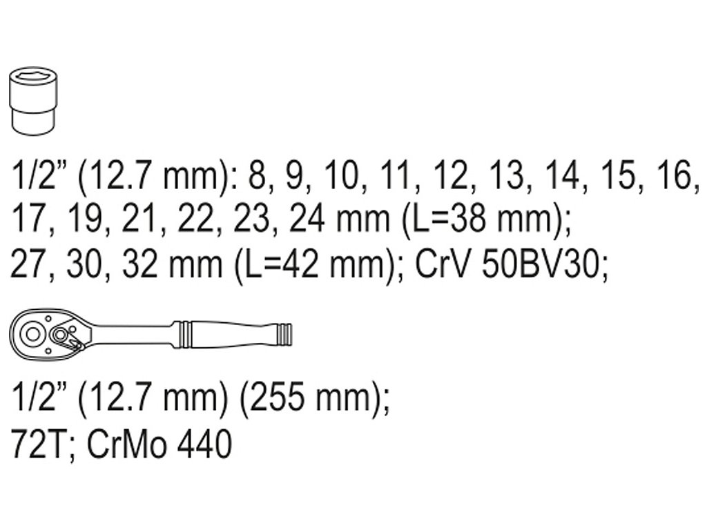| 15x | nástavec 1/2": 8; 9; 10; 11; 12; 13; 14; 15; 16; 17; 19; 21; 22; 23; 24 mm (38 mm) |