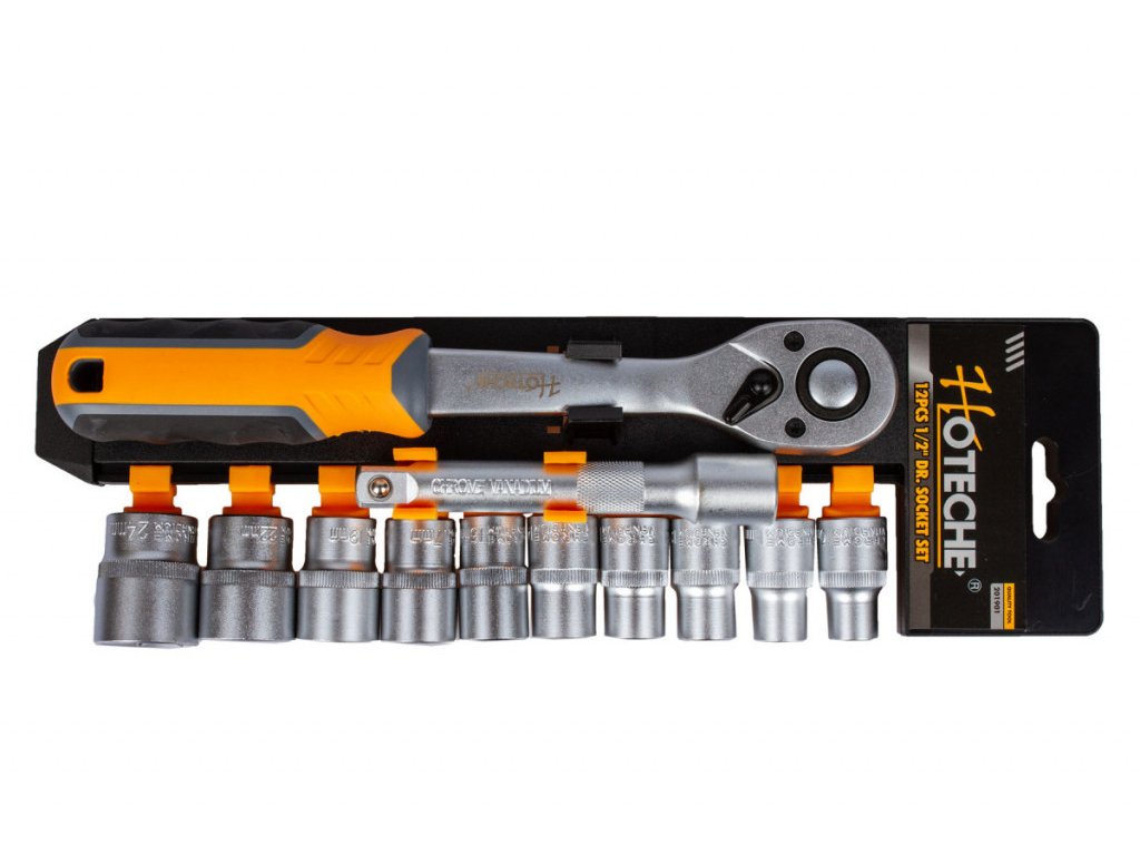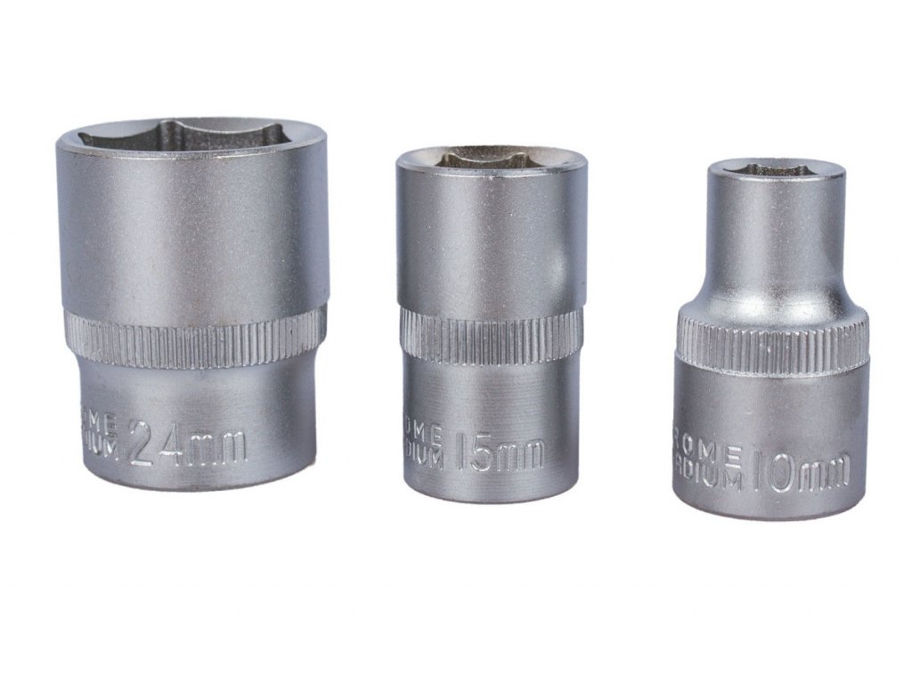 | 10 ks | nástrčné klíče 1/2″, délka 40 mm. Velikosti: 10, 11, 12, 13, 14, 15, 17, 19, 22 a 24 mm. |