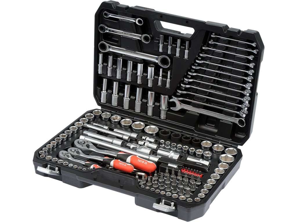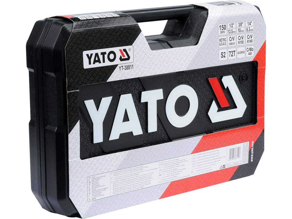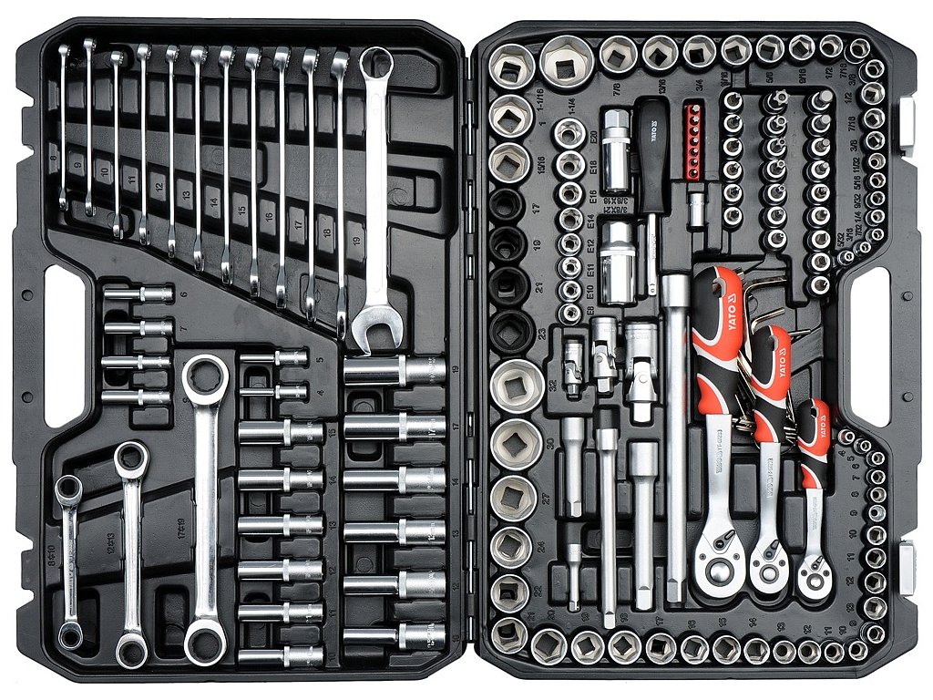Gola sada 1/2", 3/8", 1/4" obsahuje 150ks: metrických a S.A.E. nástavců, prodlužovacích nástavců, ráčny s plastovou rukojetí a 72 zubým jemným chodem, kloubové nástavce, očkoploché klíče, ráčnové klíče, nástavce s nejběžněji používanými bity a další příslušenství. Vyrobené z kvalitní chromvanadiové oceli CrMo440, CrV6140, CrV6150 a CrV50BV30, S2 s funkcí AS-DRIVE.