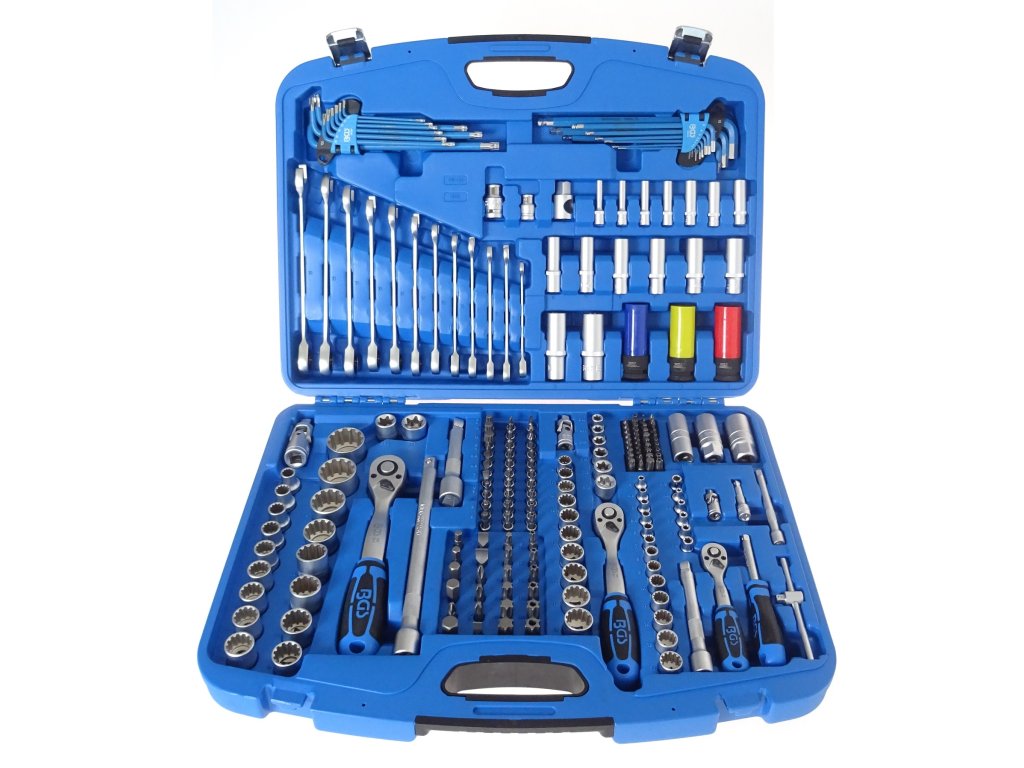 Gola sada s nářadím metrických rozměrů, vodicí čtyřhrany 1/4“, 3/8“ a 1/2“, extra velký rozsah 218 dílů v plastovém kufru – BGS technic 2290.