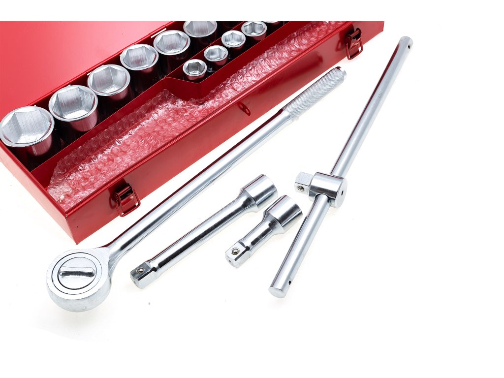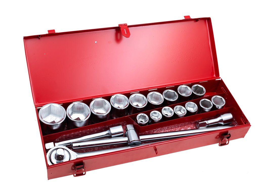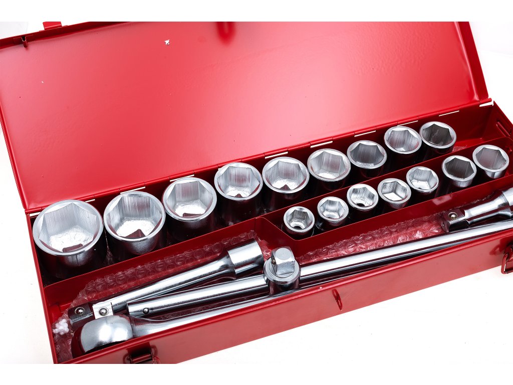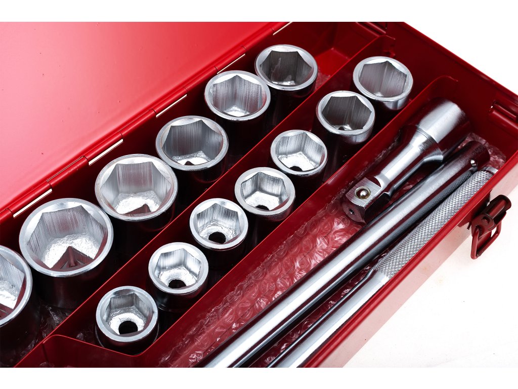 - 16x nástrčná hlavice „ořech“ 3/4": 21 – 22 – 23 – 24 – 26 – 27 – 28 – 29 – 30 – 32 – 34 – 36 – 38 – 41 – 46 – 50 mm