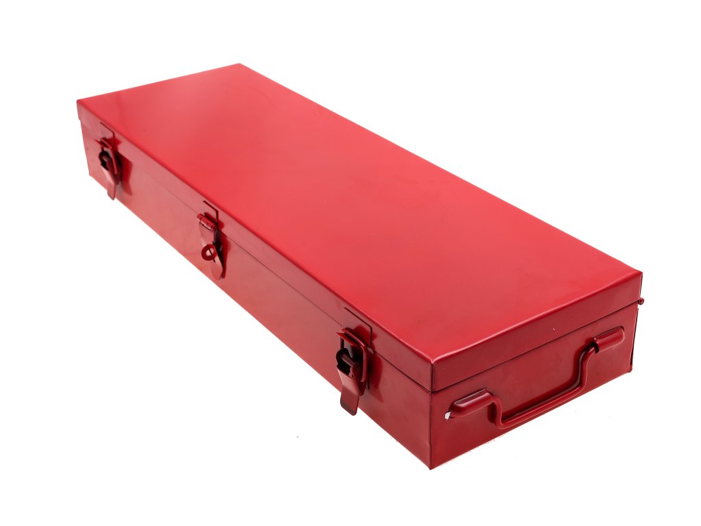 Bytelný plechový kufr je vybaven dvojicí přezek a kovovou petlicí na visací zámek – obsah je možné zajistit proti krádeži (zámeček není v sadě, nutno objednat zvlášť).