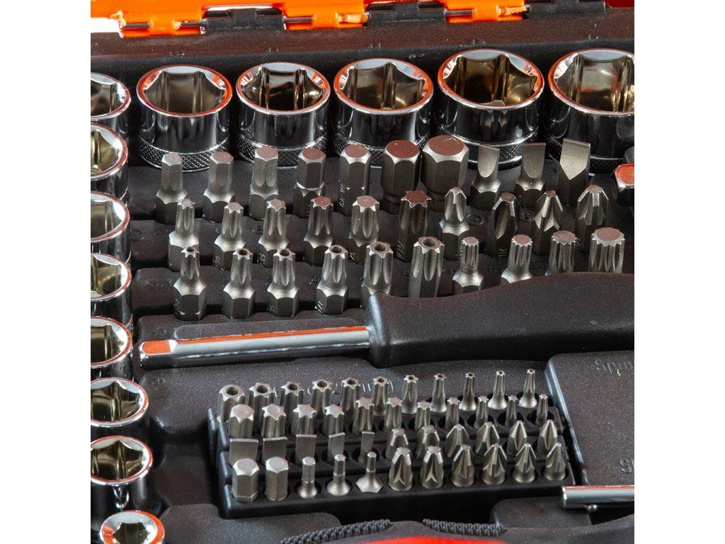 216-dílná sada obsahuje vše, co je potřeba – od hlavic, přes prodlužovací nástavce až po kardanové klouby, bity nebo očkoploché klíče.