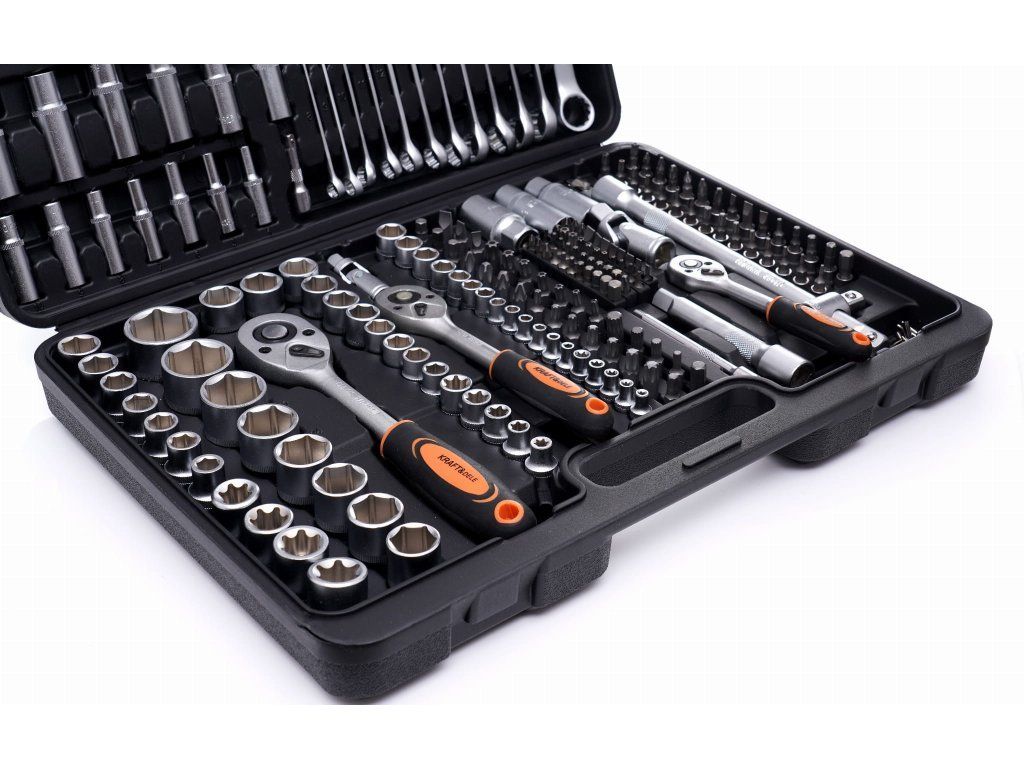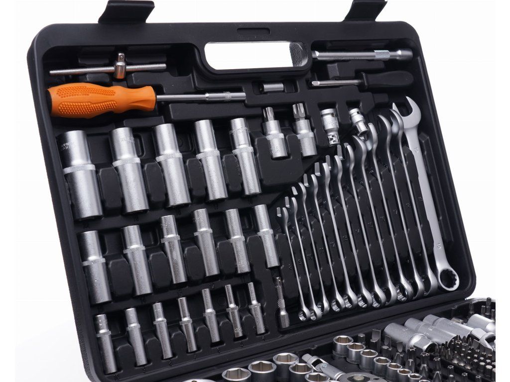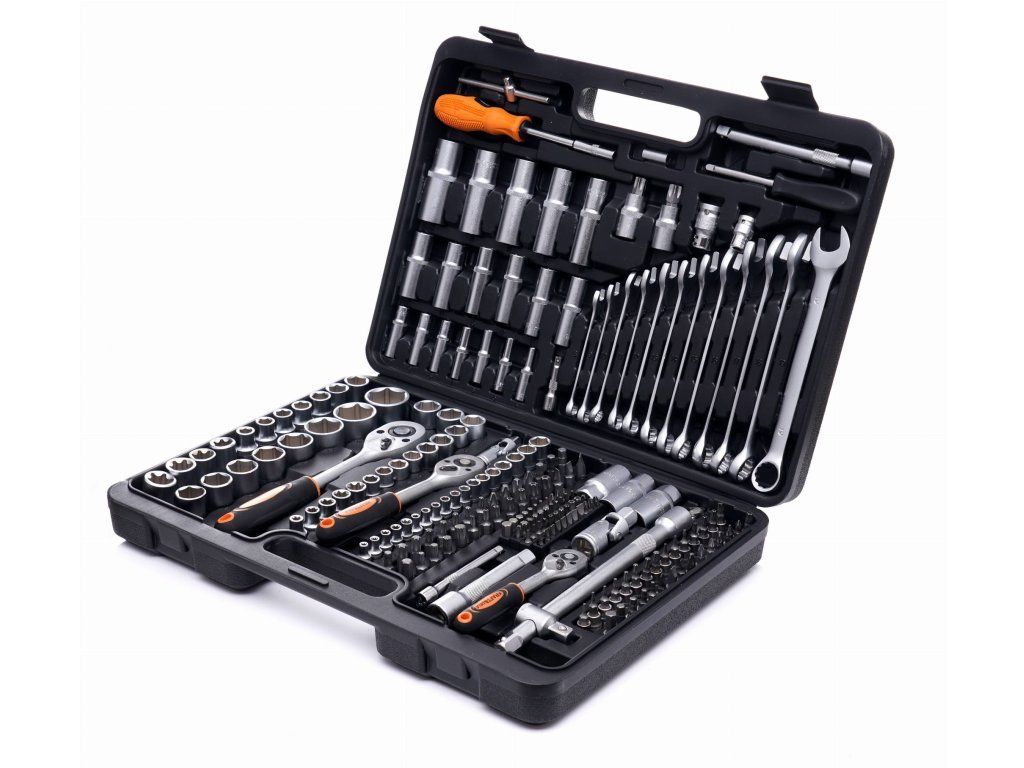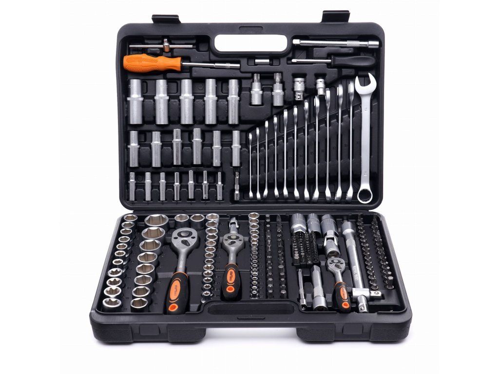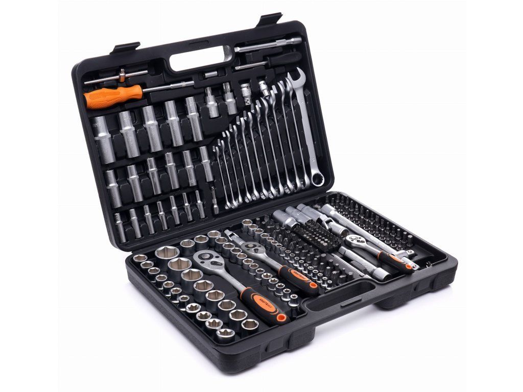 219-dílná sada obsahuje vše, co je potřeba – od hlavic, přes prodlužovací nástavce až po kardanové klouby, bity nebo očkoploché klíče.