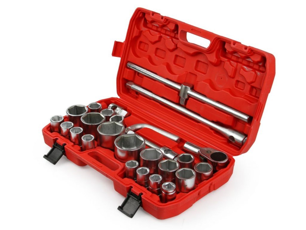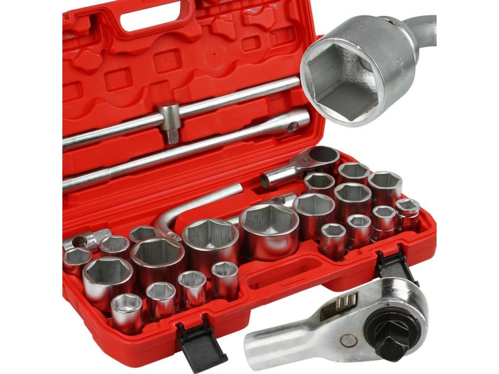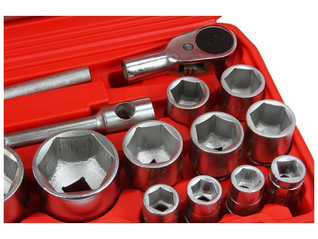 Velká sada nástrčných klíčů s ráčnou a prodloužením, vyrobená z odolného materiálu (chrom-vanadová ocel), uložená v praktickém kufru. 6-ti hranné vnitřní provedení hlavic.