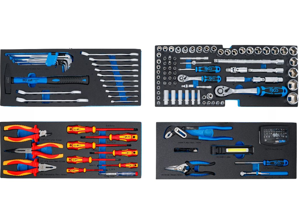 Obsah kufru se 4 pěnovými výplněmi, 147 ks nářadí:
