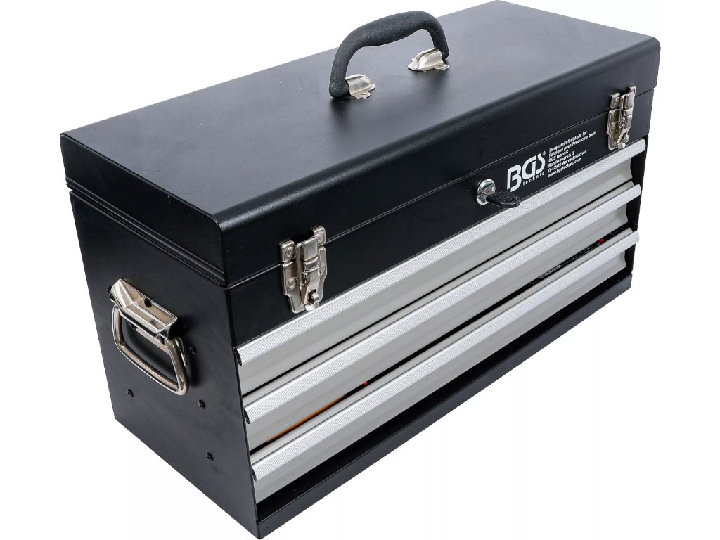 - Pevný kovový kufr se třemi zásuvkami a horní přihrádkou