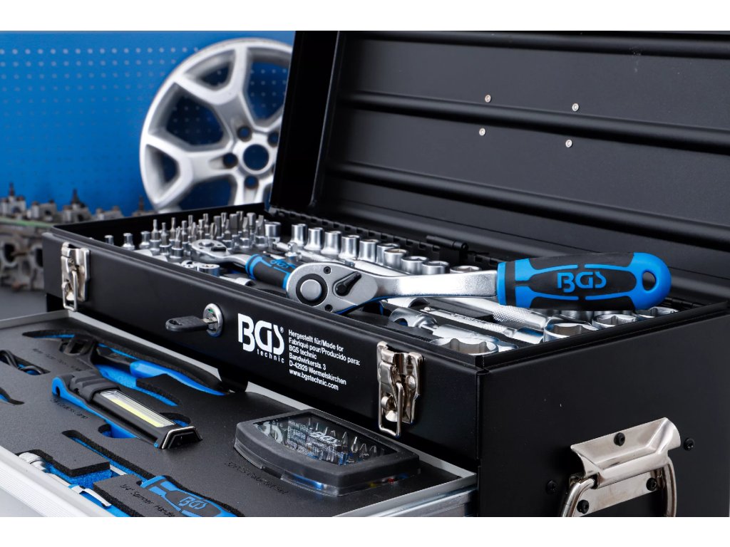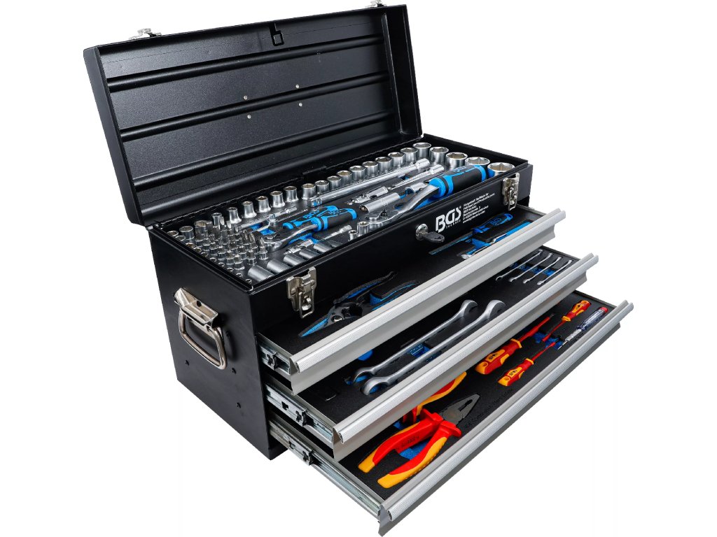 Sada nářadí v kovovém kufru | 3 zásuvky | horní přihrádka | 147 ks | BGS