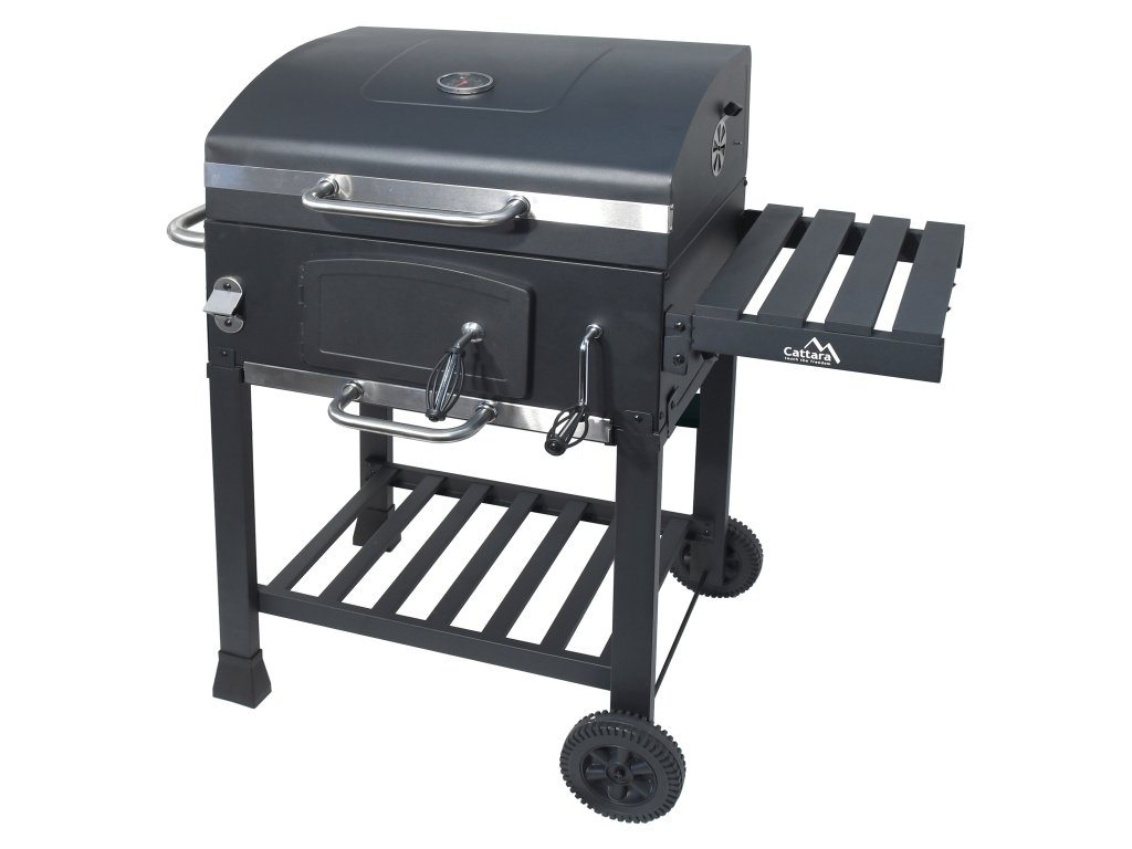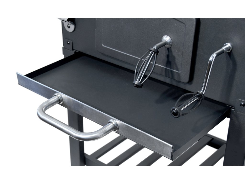 Konstrukce z oceli je opatřena hrubou černou barvou. Madla a ovládací kovové prvky, mají dostatečné rozměry pro pohodlný úchop a zajišťují precizní ovládání. Oboustranná regulace ventilace perfektně lícuje s konstrukcí. Další předností je rošt na uhlí s nastavitelnou výškou 9-21 cm od grilovacího prostoru, pomocí kličky na přední straně. Dvířka na čelní straně grilu usnadňují doplňování uhlí.