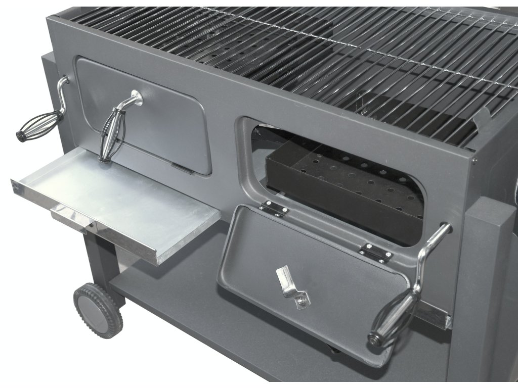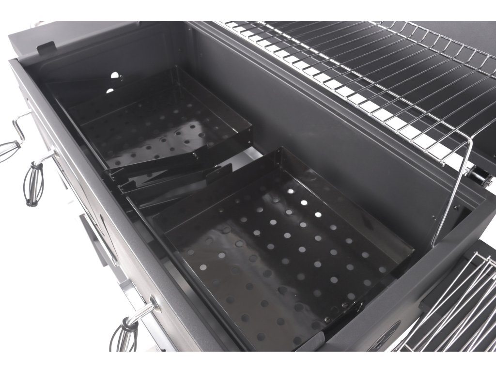 Další předností grilu jsou rošty na uhlí s nastavitelnou výškou, grilovací prostor je tak možné regulovat pomocí mechanismů na přední straně, dle požadávků daných pokrmů. Dvířka na čelní straně grilu významně usnadňují doplňování uhlí. Pro usnadněné číštění jsou potom určeny zásuvky na popel v nejspodnější části grilovacího prostoru.