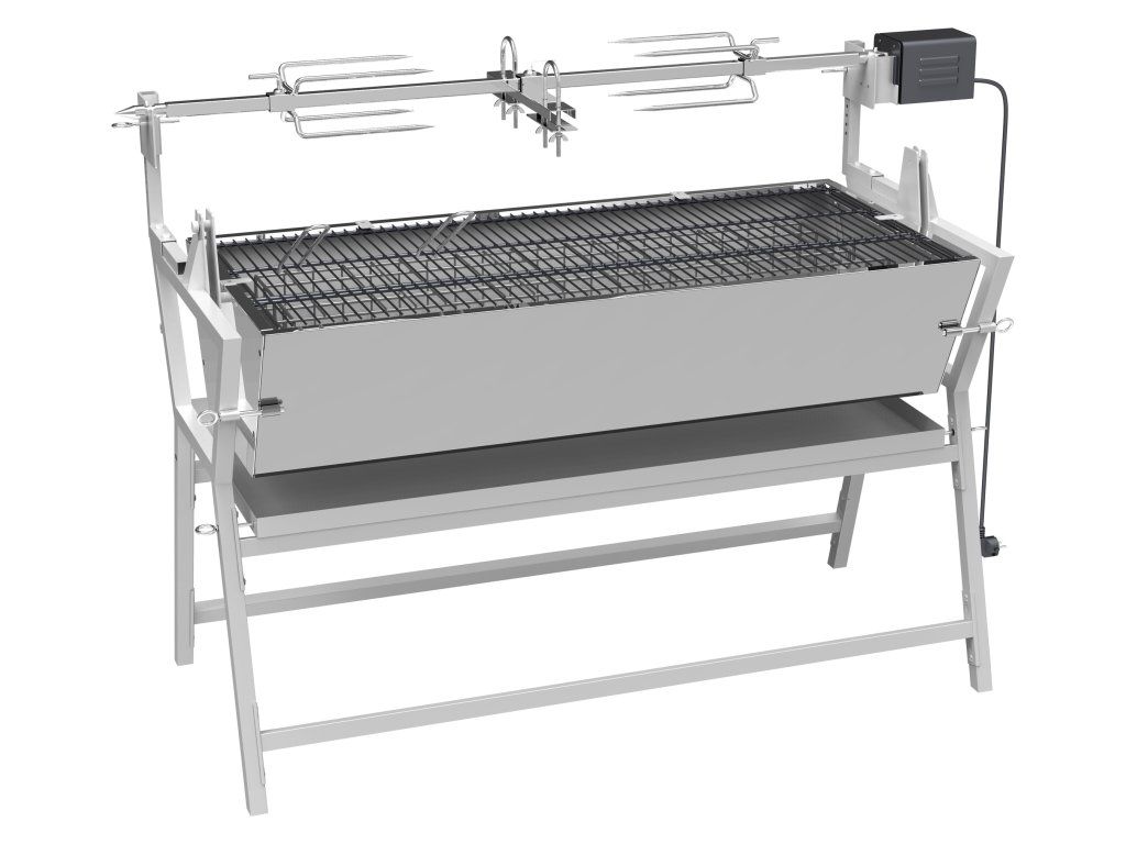 Gril na dřevěné uhlí s robustní konstrukcí PIGLET s motorem pro otáčení pokrmů.