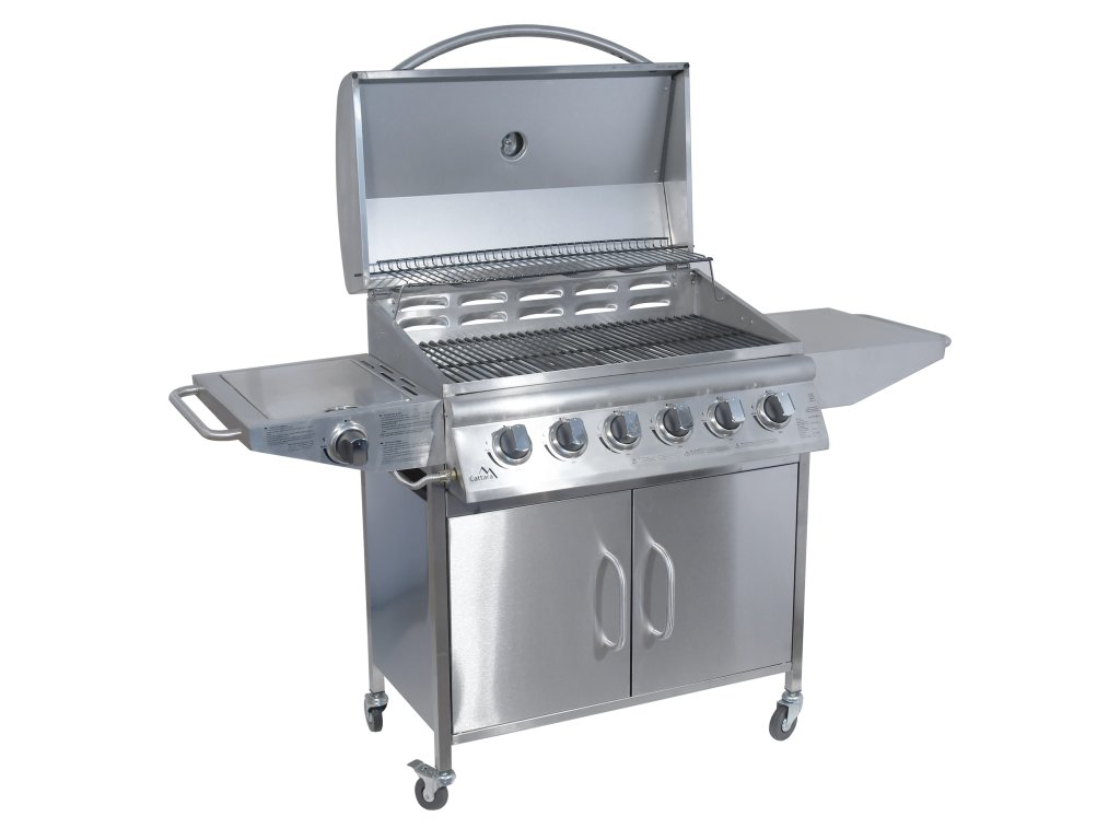 Gril je pojízdný (4 kolečka z toho 2 bržděná), osazen sklopným víkem s teploměrem a odkládací poličkou na příslušenství. Dále byl doplněn bočním vařičem se samostatnou regulací a piezo zapalováním. Ve střední části je objemná, uzavíratelná skříňka s dvířky. Součástí je i spojovací hadice k plynové lahvi a redukční ventil.