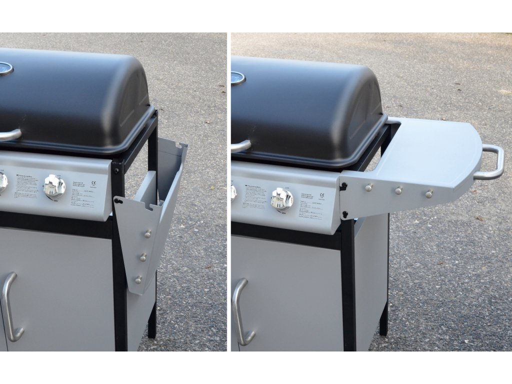 Gril je pojízdný (2 kolečka), je vybaven sklopným víkem s teploměrem a odkládacími poličkami s háky na příslušenství. Dále je vybaven přídavným bočním vařičem se samostatnou regulací a piezo zapalováním. Ve střední části je uzavíratelná skříňka s dvířky. Součástí je i spojovací hadice k plynové lahvi a redukční ventil. Díky sklopné boční poličce se gril snadno skladuje.