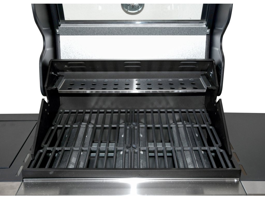 Sklopné víko grilu je opatřeno průzorem, díky kterému je možné sledovat stav grilovaných pokrmů bez otevírání grilu. Gril je vybaven odkládacími poličkami na obou stranách, z nichž jedna je doplněna o boční vařič. Součástí je i spojovací hadice k plynové lahvi a redukční ventil.