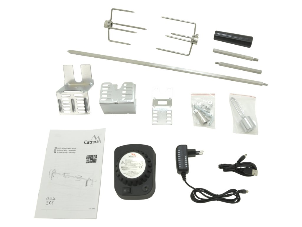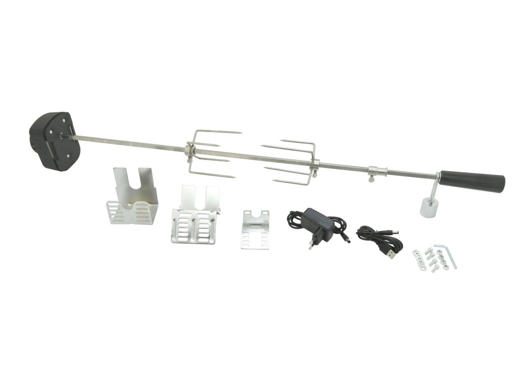 Motor disponuje rychlostí 3 otáčky za minutu, čímž zajišťuje rovnoměrné grilování kuřat, špízů a různých bloků masa, postupně ze všech stran. Motor lze napájet ze standardní zásuvky 230 V, nebo pomocí USB kabelu (5V) například z powerbanky.