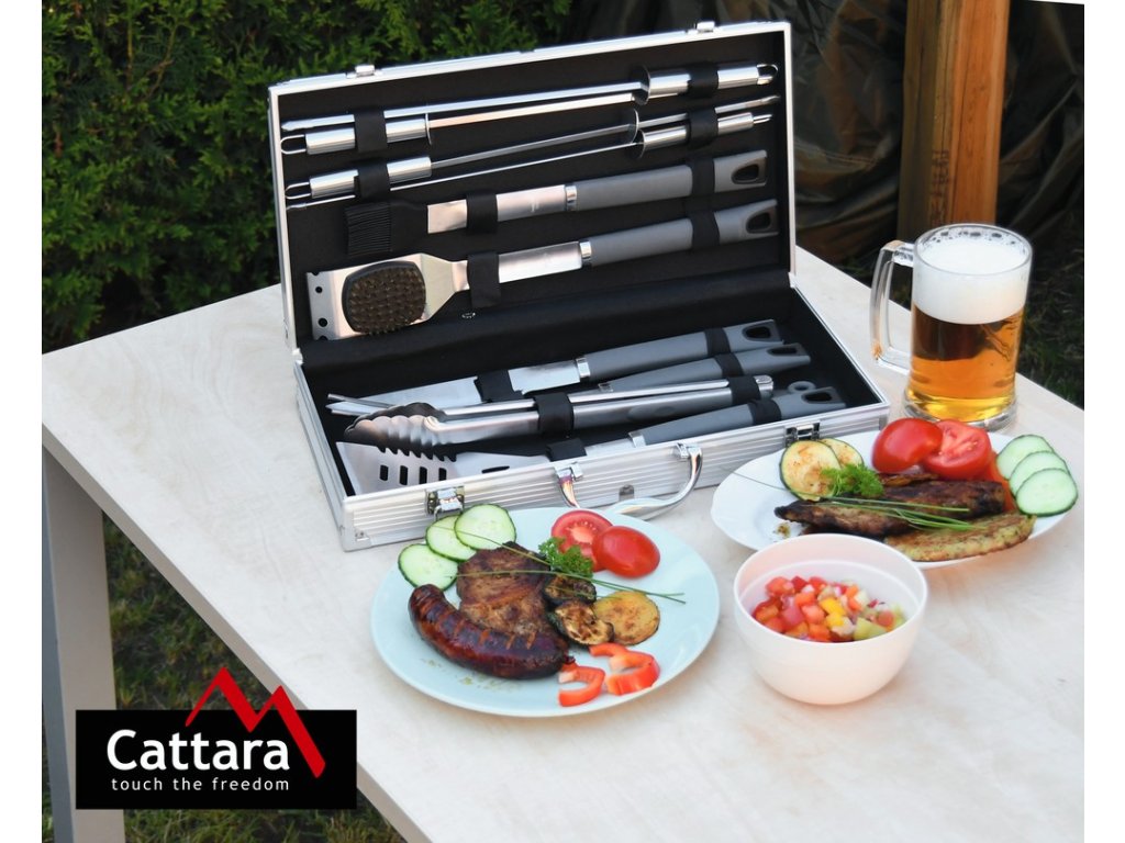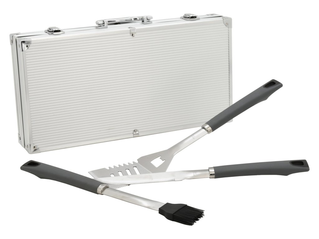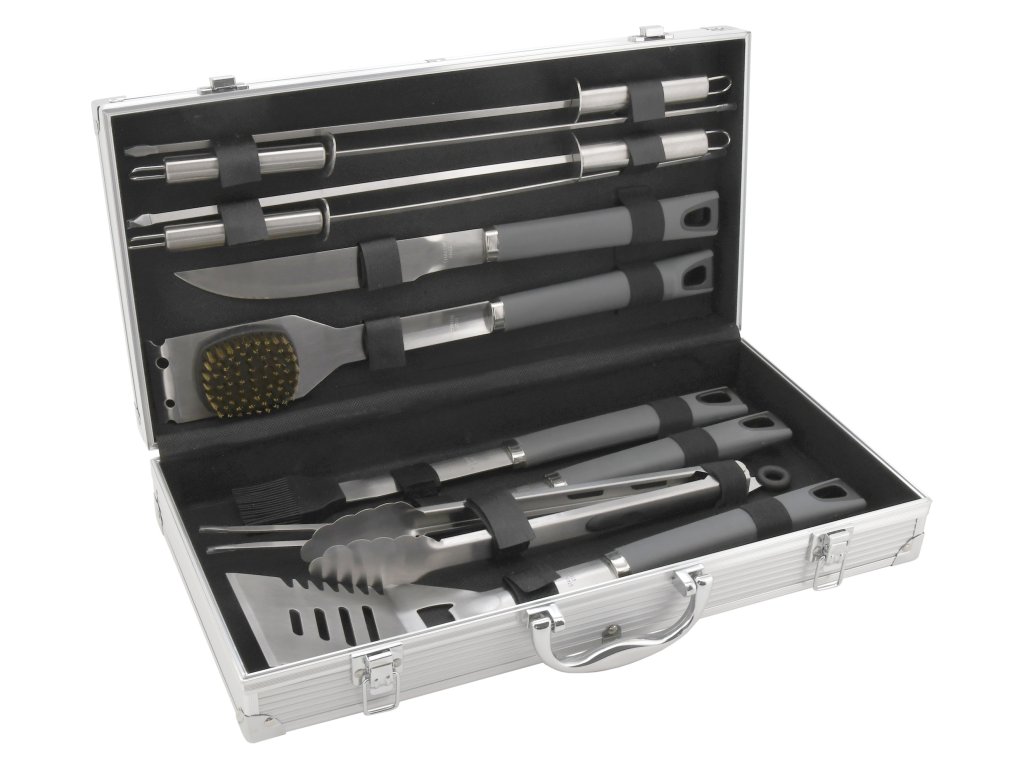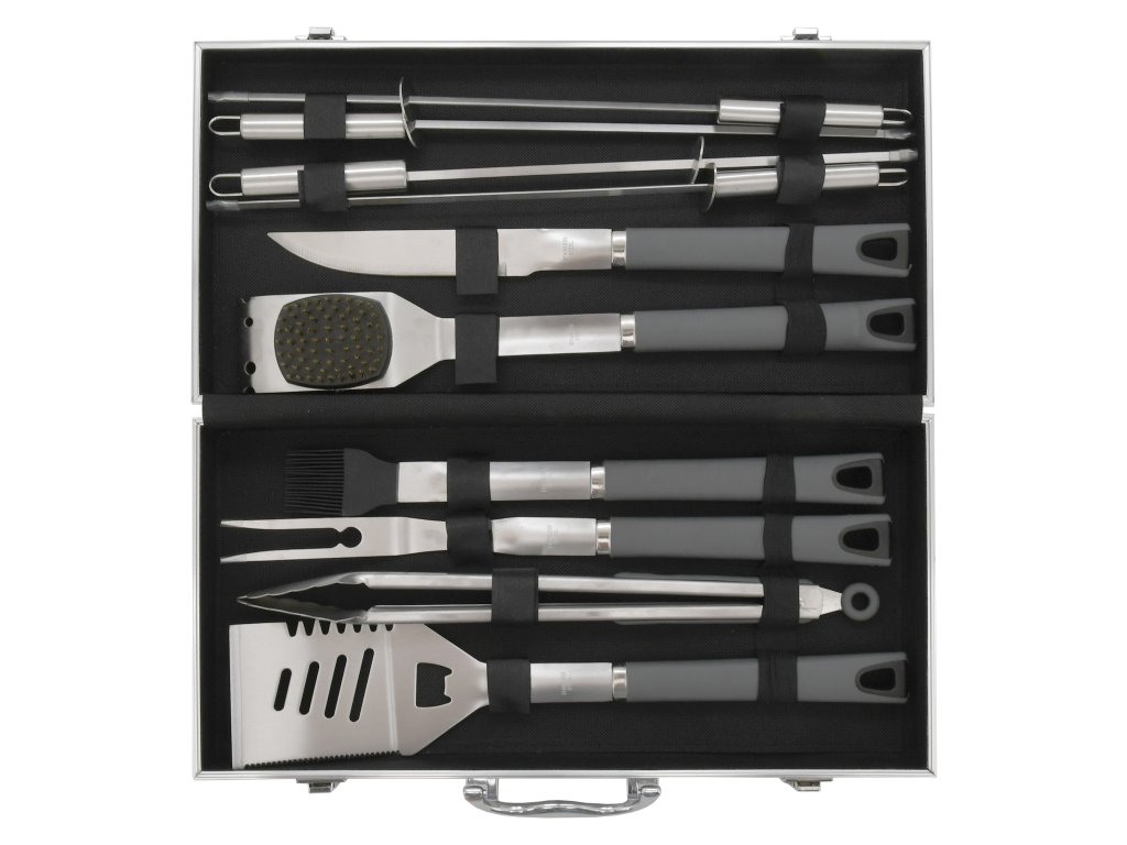 V sadě se nachází obracečka s precizně zabroušenou hranou vybavená zoubkovaným ostřím, otvírákem zátek a otvory pro odtok. Kleště, speciálně tvarované pro jistý úchop nejrůznějších pokrmů, kartáč pro údržbu grilu, kdy samotná kartáčová část je z mosazi. Nepostradatelnou částí grilovcího nářadí je i dvouzubá vidlička, štětec se štětinami z nylonu, pro potírání, či mašlování pokrmů, porcovací nůž a 4x grilovací jehlice s hroty broušenými do špičky.