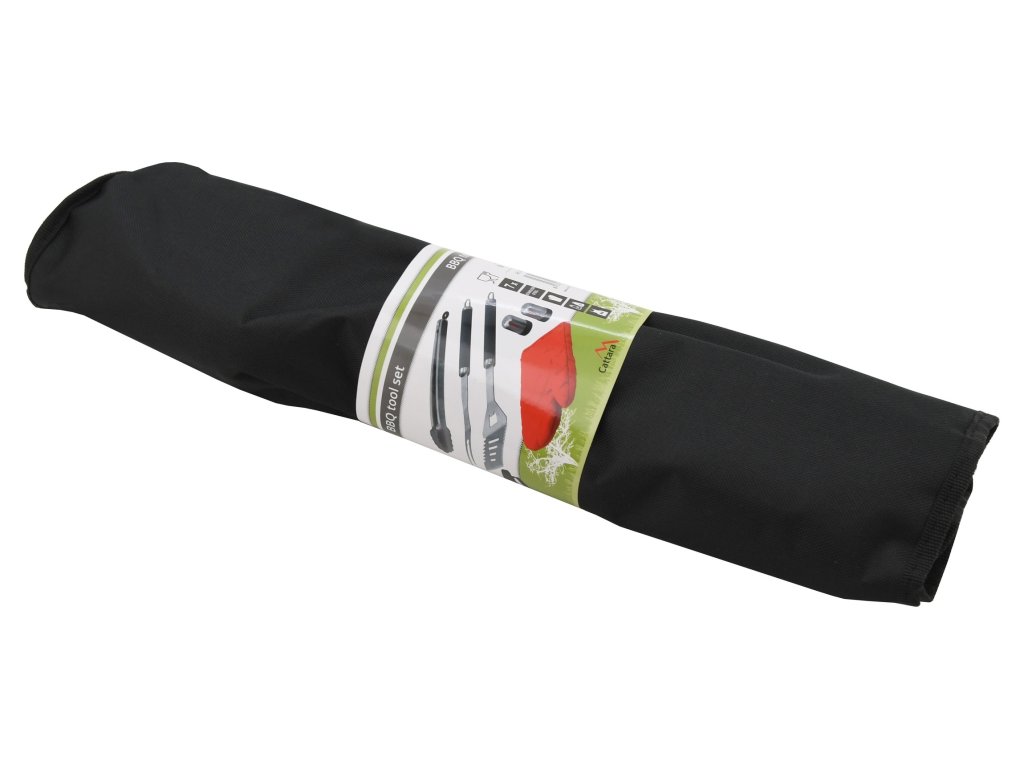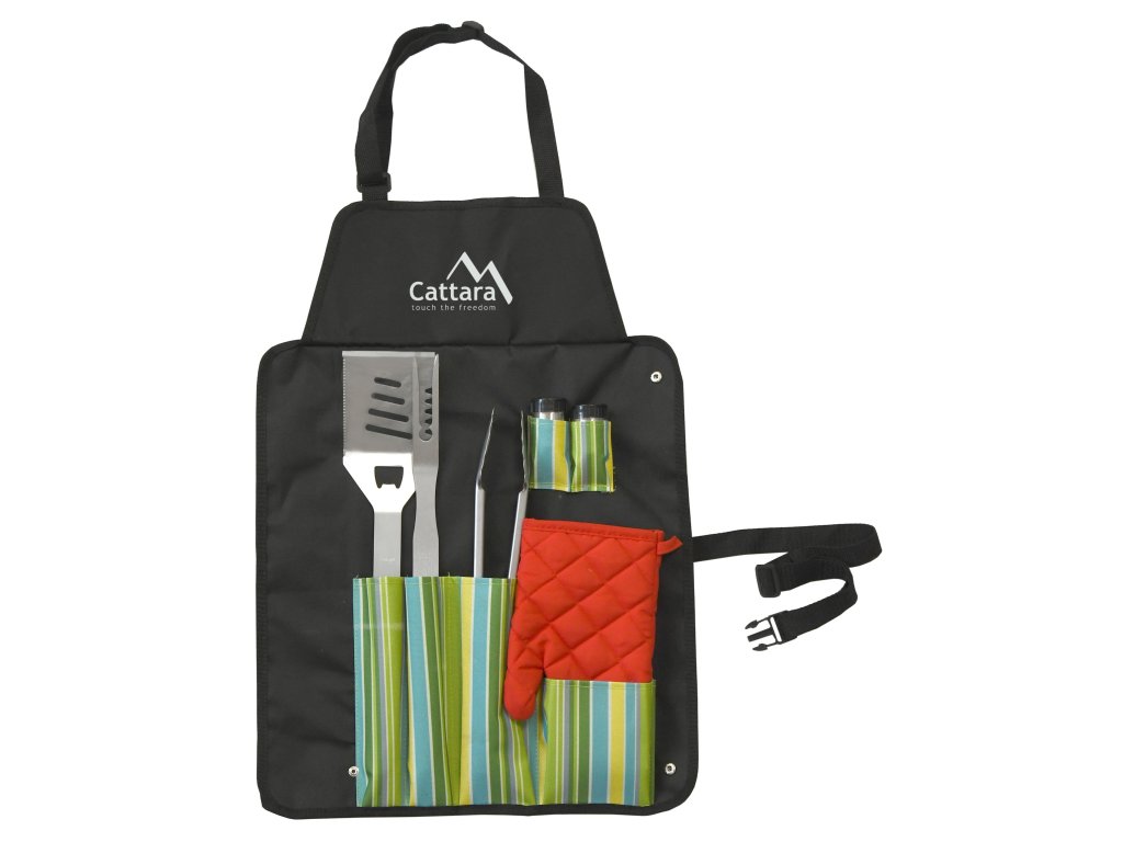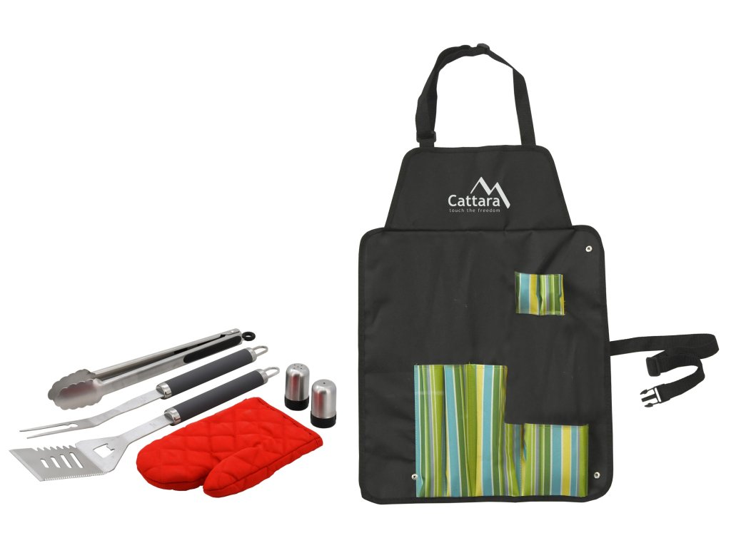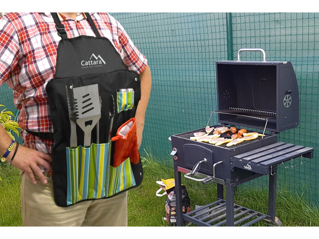 Sada nářadí a zástěry pro grilování, skládající se ze zástěry opatřené kapsami a slánkou, s pepřenkou, rukavicí a klasickými nástroji jako obracečka, vidlička a kleště.