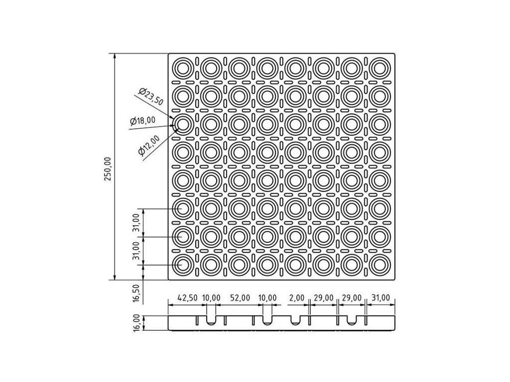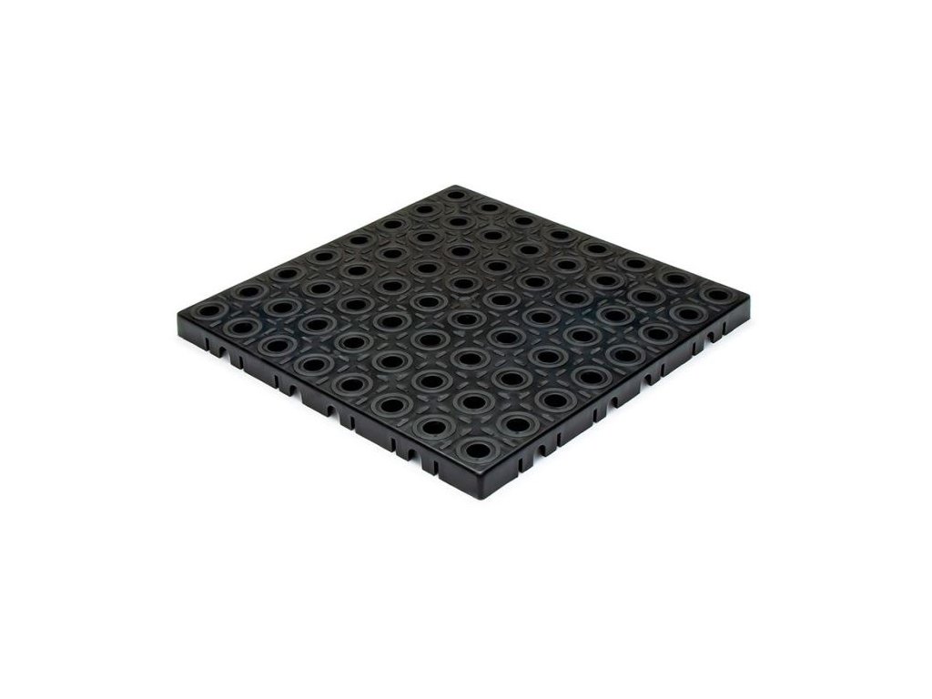 GripTil dlaždice černá Standard Toto zboží je na objednávku, doba expedice cca 7dní.Základní deska 250x250x16mm je elementárním prvkem plastového podlahového systému. Dlaždice GripTil je vyrobena z plastového granulátu a dodáváse ve tvrdém Hard a měkkém Standard provedení. Povrch dlaždice je děrovaný, spodní strana je žebrovaná a propojená kanály, které zajišťují rychlý a trvalý odvod vody pod povrchem plastové podlahy. Z další charakteristiky je možné jmenovat tlumení vibrací, protiskluzové a protihlukové vlastnosti a snížení prašnosti. Plastové desky jsou odolné vůči většině chemikálií, olejů, barev, kyselin rozpouštědel. Doporučené rozmezí teplot použití je od -40 do +60°C.