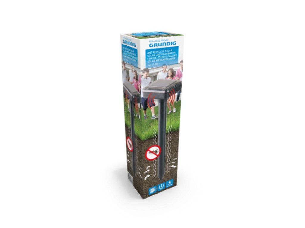 Ultrazvukový odpuzovač mravenců Grundig díky svému tvaru lze odpuzovač mravenců Grundig snadno umístit do každé zahrady. Systém vydává zvuk o frekvenci přibližně 500 Hz po dobu přibližně 2 sekund každých 10-30 sekund. Tento zvuk dráždí mravence a způsobuje jejich odhánění. Systém také vytváří řadu vibrací, které mravence dále ruší. Solární panel umožňuje nabíjení během denního světla.Doplňkové parametry