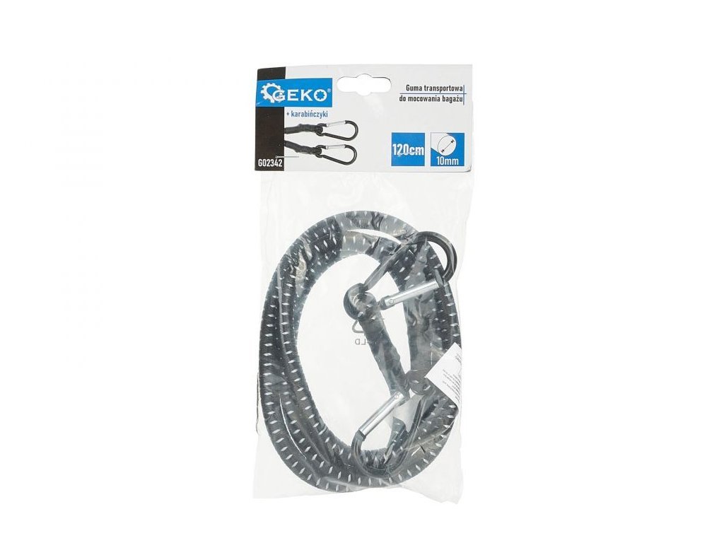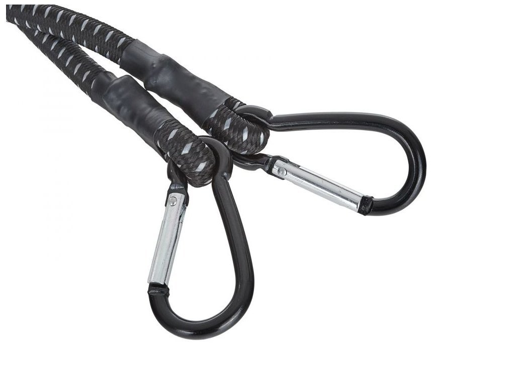 Upínací guma v délce 120 cm s karabinami pro uchycení předmětů při přepravě. Kovové karabiny jsou bezpečné a odolné.