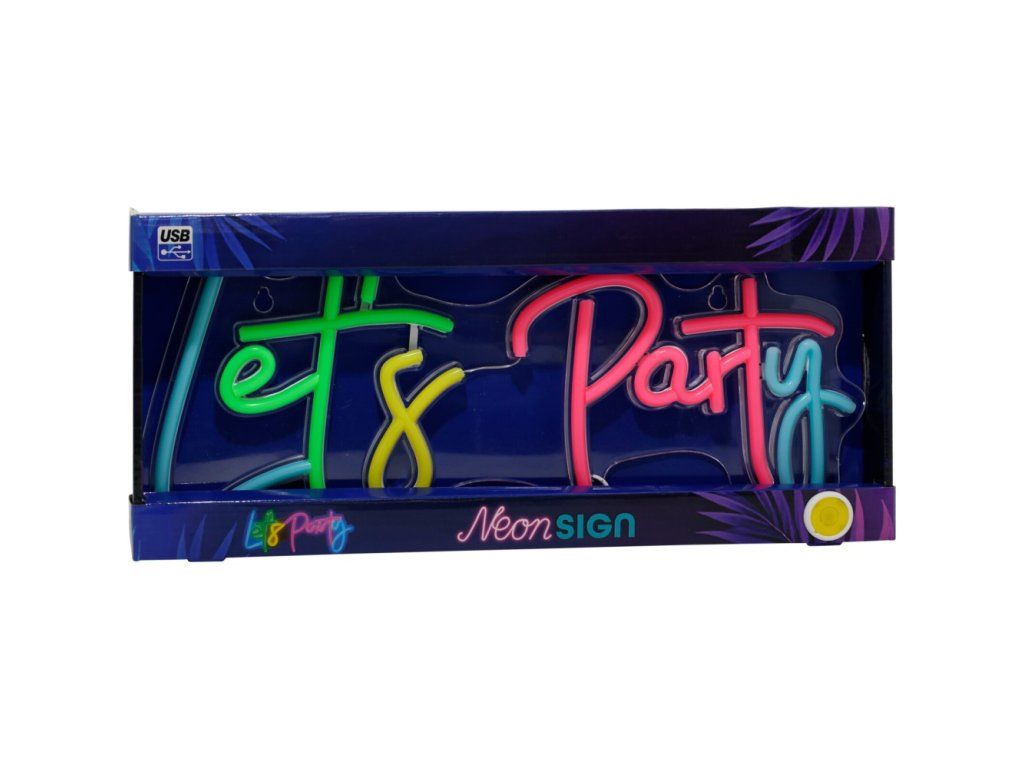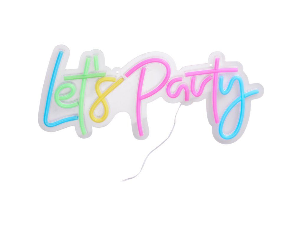 - Neonová nástěnná dekorace s nápisem „LET’S PARTY“