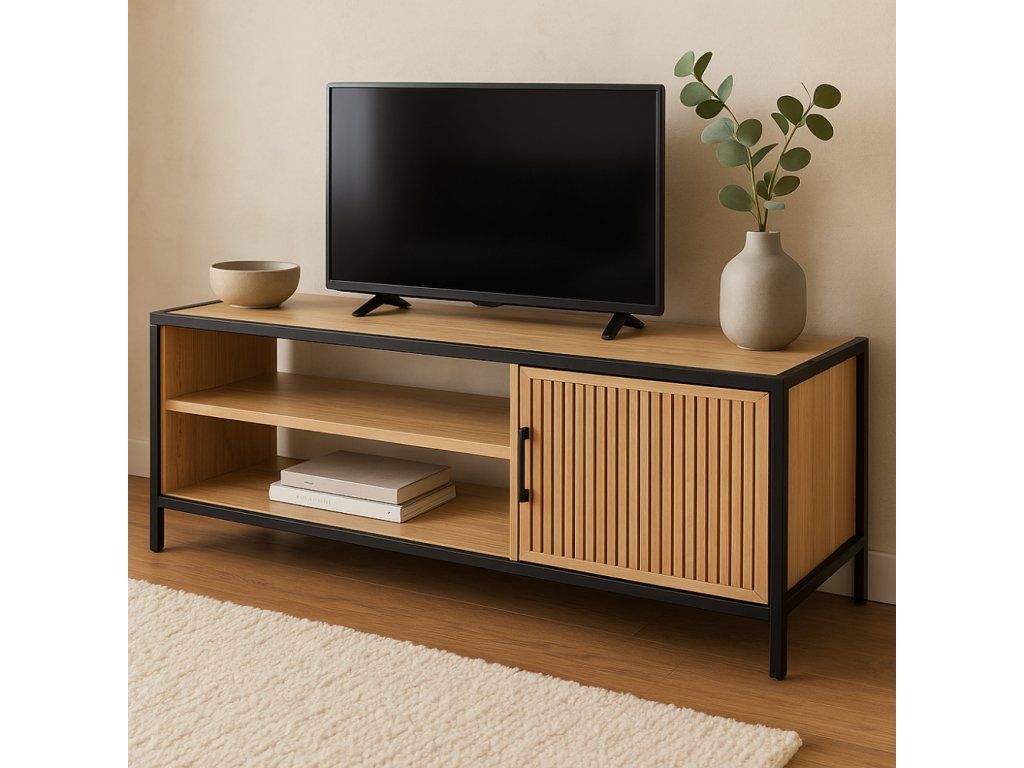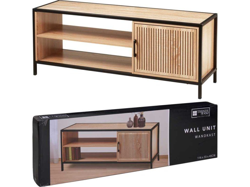 Moderní kombinace černého kovu a přírodní dýhy zajišťuje elegantní vzhled vhodný do obývacího pokoje, pracovny nebo chodby.