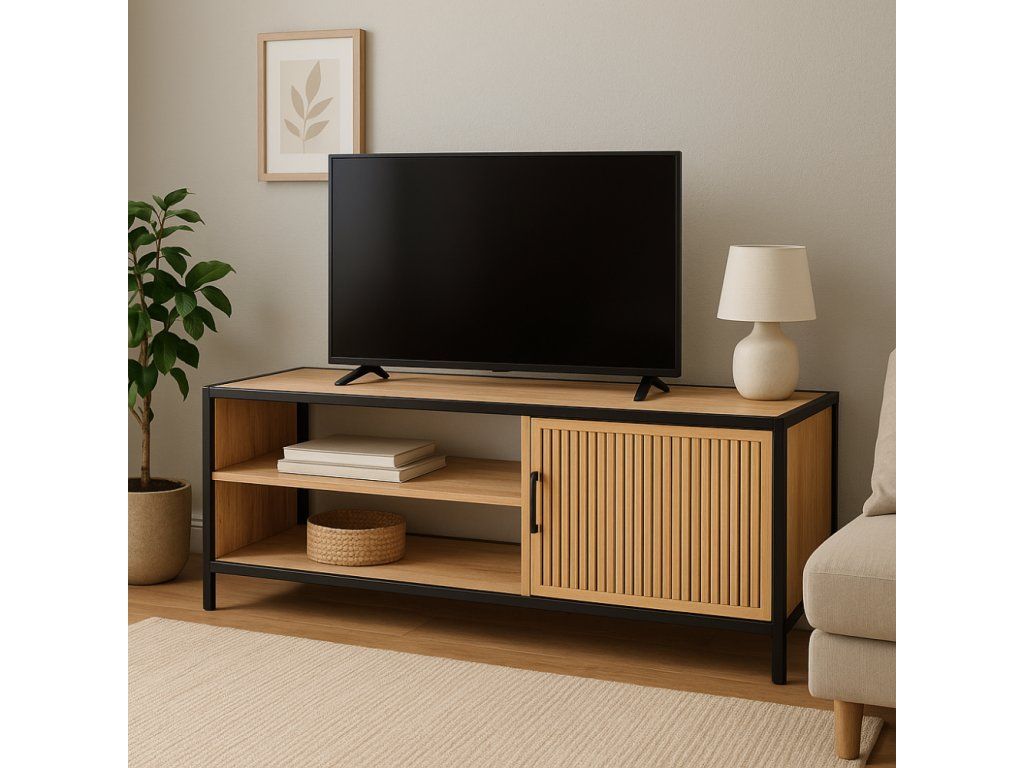 Stylová skříňka s černým kovovým rámem, vybavená MDF policemi a dveřmi z přírodní MDF dýhy, s 3 úložnými vrstvami pro praktické uložení drobných předmětů.
